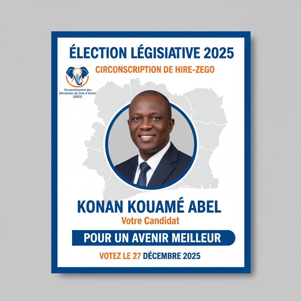 Prompt: Flyer du candidat Konan Kouamé Abel à l'élection législative du 27 décembre 2025 pour la circonscription de HIRE-ZEGO