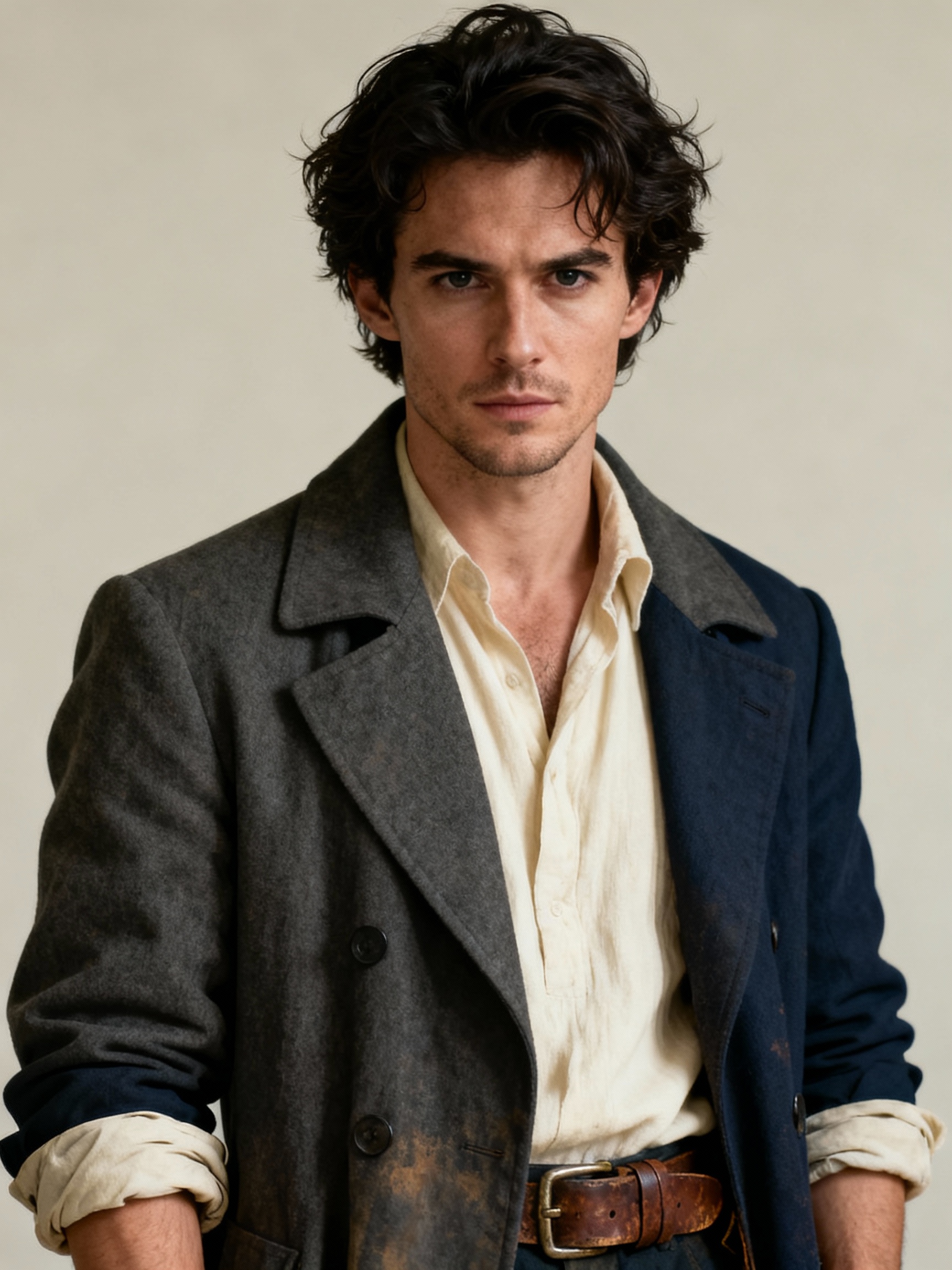 Prompt: a 25 year old man. Strong jawline, intense dark eyes. Thick, dark, and perpetually tousled in a casual yet deliberate manner. Quiet exactness, as if always prepared to explain or redact something. Wears contradiction like a tailored coat, suggesting a blend of formal and informal elements. Commanding presence, yet never loud or overbearing. Walks with a sense of calm, as if he has nowhere to be and no intention of being late. Appears to have read every policy manual and memorized the loopholes, indicating a sharp, analytical mind