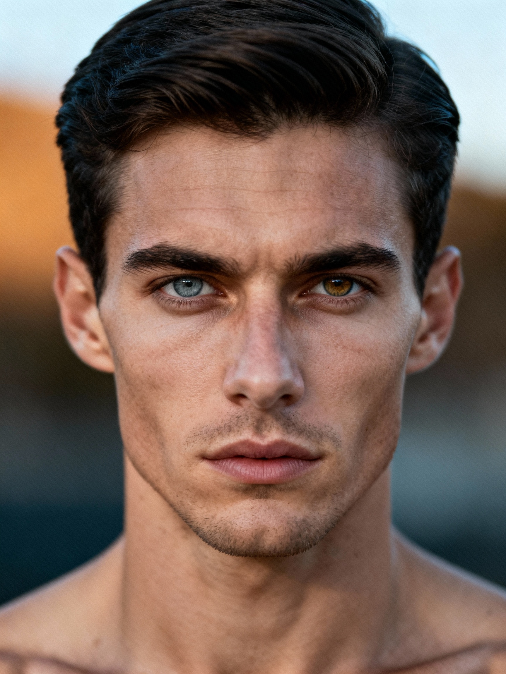 Prompt: 25 year old man. Julian has angular features that exude a sense of refined ruggedness. His face is chiseled, with high cheekbones and a sharp jawline that speaks to a background of discipline and resilience. His dark hair is kept short, meticulously groomed to reflect an air of precision and control. The neatness of his hair hints at a meticulous personality. Julian's eyes are strikingly piercing, appearing gray in some lights and hazel in others. This dual nature of his eye color adds to his enigmatic presence, making him seem mysterious and unreadable at first glance.  He possesses a lean, athletic build, honed from what seems to be a background in rigorous physical training. His physique suggests he could be a former athlete or military personnel, someone who values strength and endurance. Julian carries himself with an air of composure that borders on aloofness. There's a stillness about him, a calm that can initially come across as cold or distant. However, those who know him understand that this exterior is a facade, a carefully crafted shield to protect his true self.