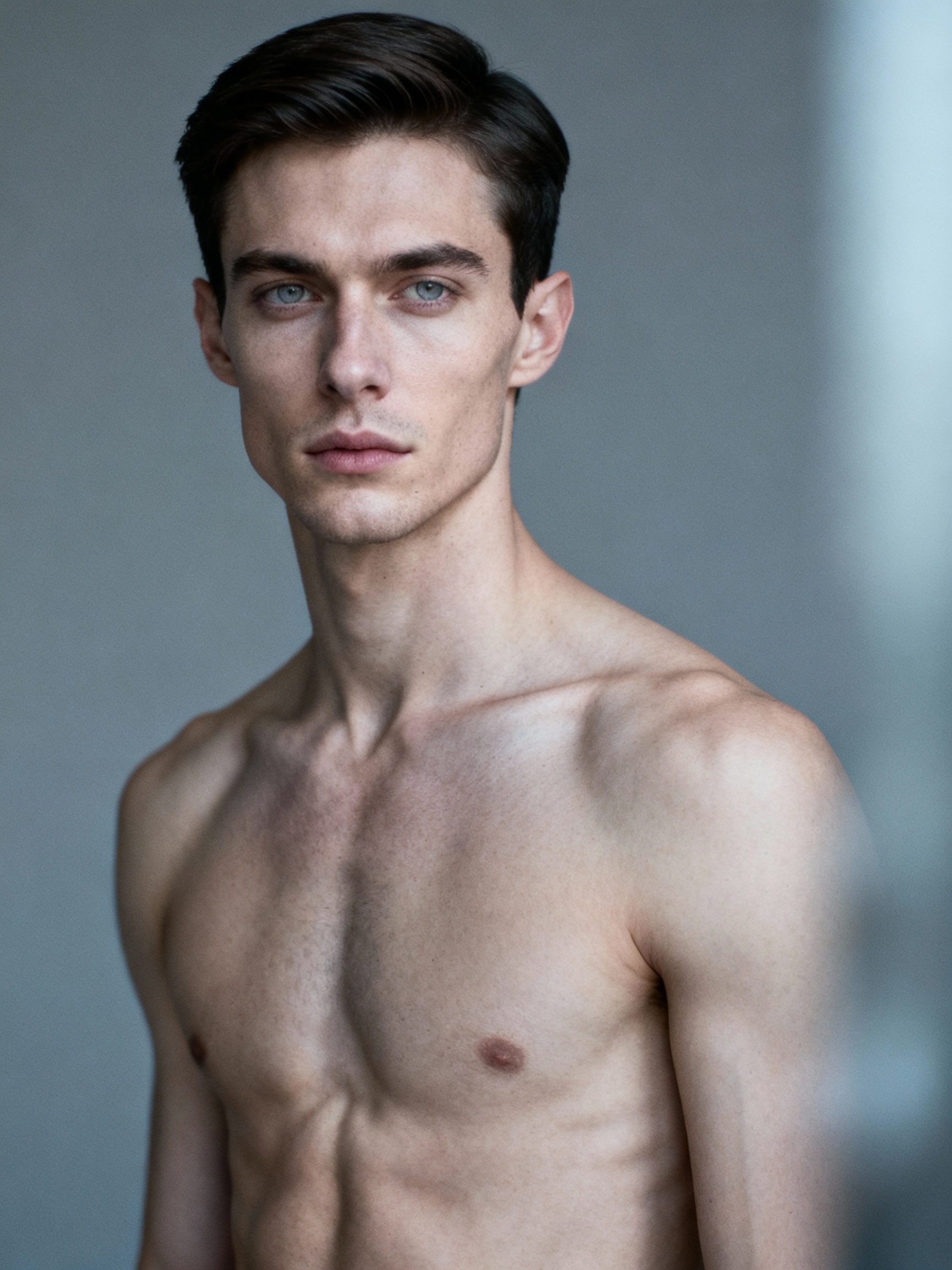 Prompt: 25 year old man. Julian has angular features that exude a sense of refined ruggedness. His face is chiseled, with high cheekbones and a sharp jawline that speaks to a background of discipline and resilience. His dark hair is kept short, meticulously groomed to reflect an air of precision and control. The neatness of his hair hints at a meticulous personality. Julian's eyes are strikingly piercing, appearing gray in some lights and hazel in others. This dual nature of his eye color adds to his enigmatic presence, making him seem mysterious and unreadable at first glance. He possesses a lean, athletic build, honed from what seems to be a background in rigorous physical training. His physique suggests he could be a former athlete or military personnel, someone who values strength and endurance. Julian carries himself with an air of composure that borders on aloofness. There's a stillness about him, a calm that can initially come across as cold or distant. However, those who know him understand that this exterior is a facade, a carefully crafted shield to protect his true self.