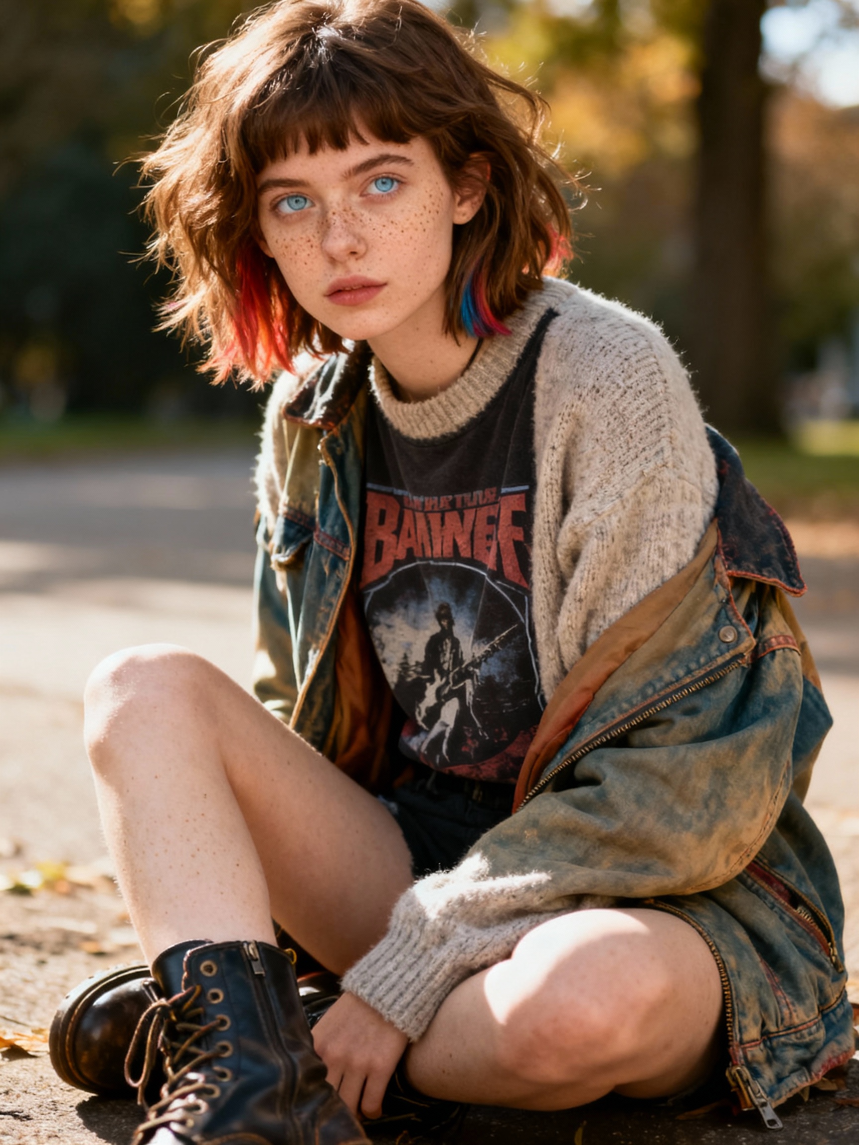 Prompt: a 25 year old person. Wren has delicate, fine-boned features with a soft, "forever-young" appearance. Pale with warm undertones and freckles that become more visible in sunlight. Large, expressive, cool grey-blue eyes with an unreadable quality. Soft, tousled brown hair, sometimes dyed in bold colors, cut in choppy layers. Wren's style includes: Loose sweaters Vintage jackets Combat boots Thrifted band tees