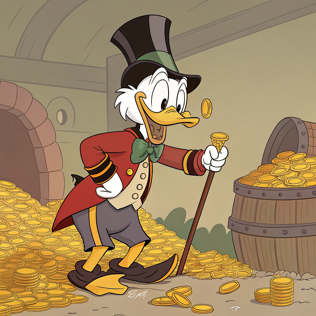 Prompt: Scrooge McDuck, full-length, greedy grin, pining over his wealth