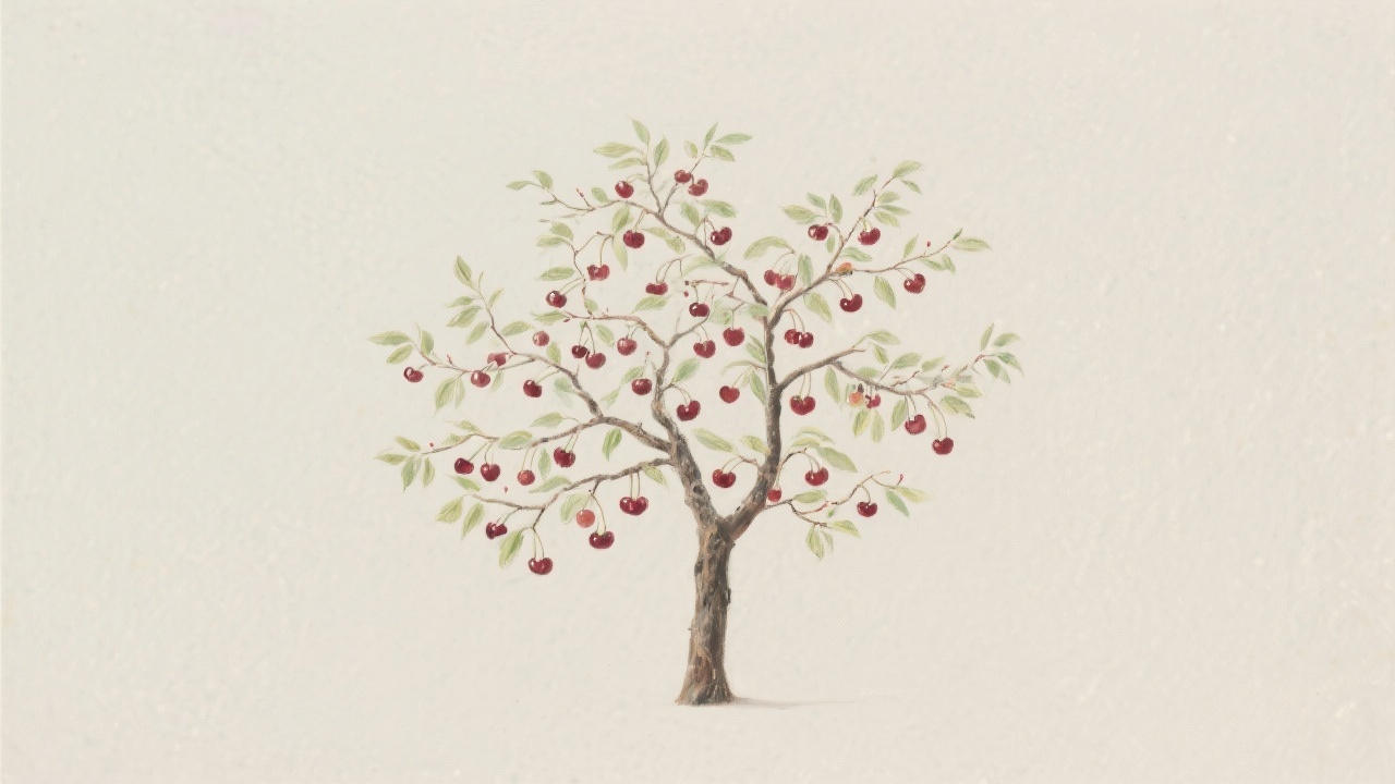 Prompt: a painting of a cherry tree, Prunus avium (sweet), Prunus cerasus (sour), on a completely blank background.