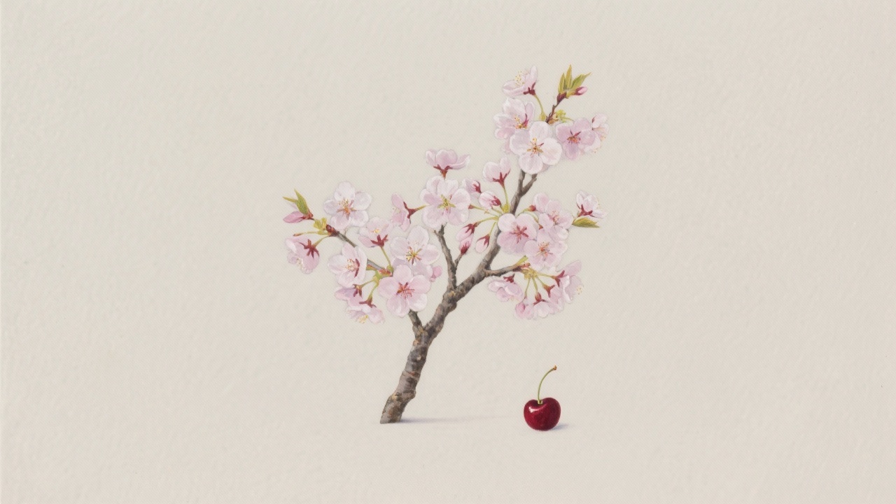 Prompt: a painting of a flowering cherry tree, Prunus avium (sweet), Prunus cerasus (sour)and a cherry, on a completely blank background.