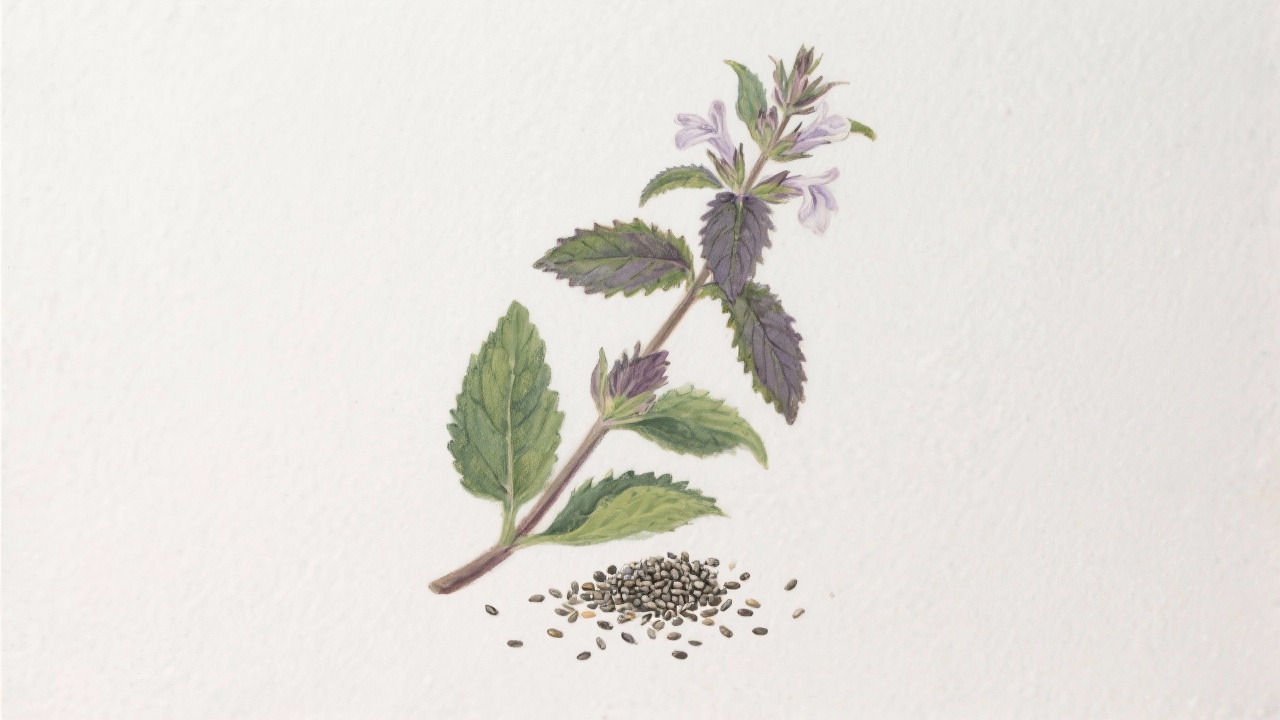 Prompt: a painting ofSalvia hispanicawith chia seeds, on a completely blank background.