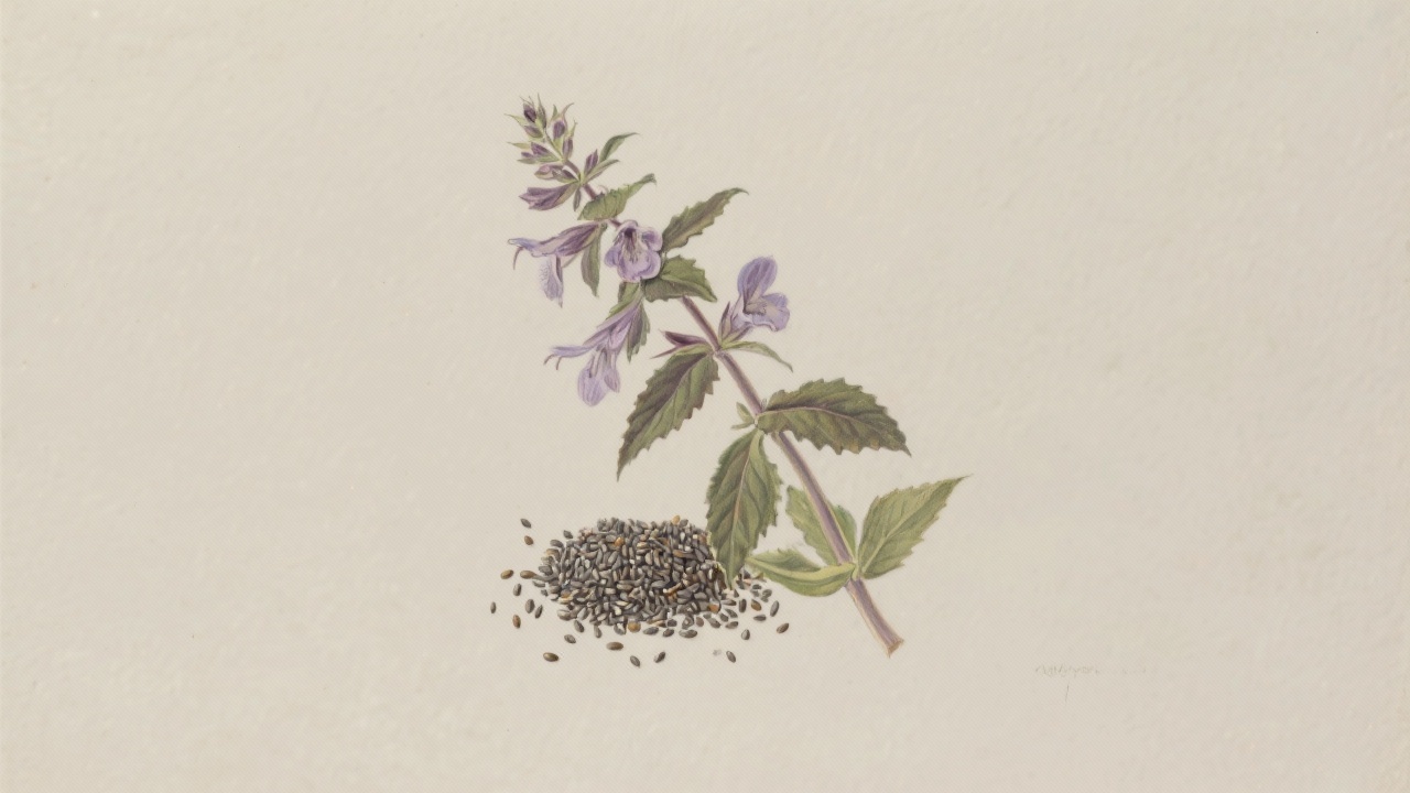 Prompt: a painting ofSalvia hispanicawith chia seeds, on a completely blank background.