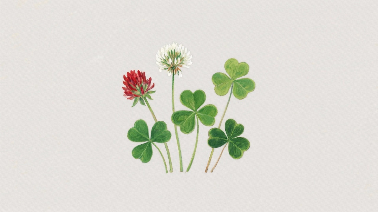 Prompt: a painting of a group of clovers, (red clover, white clover, three leaf clovers, four leaf clover), on a completely blank background.
