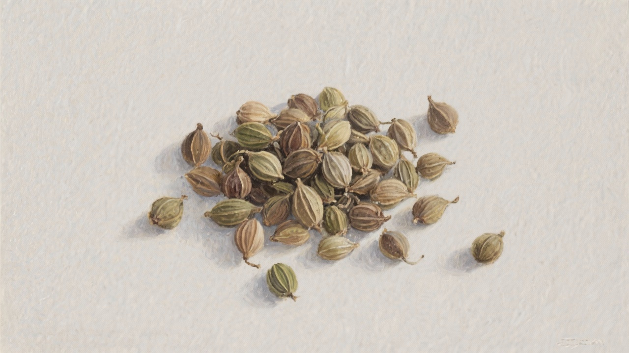 Prompt: a painting of Corriander seeds, on a completely blank background.