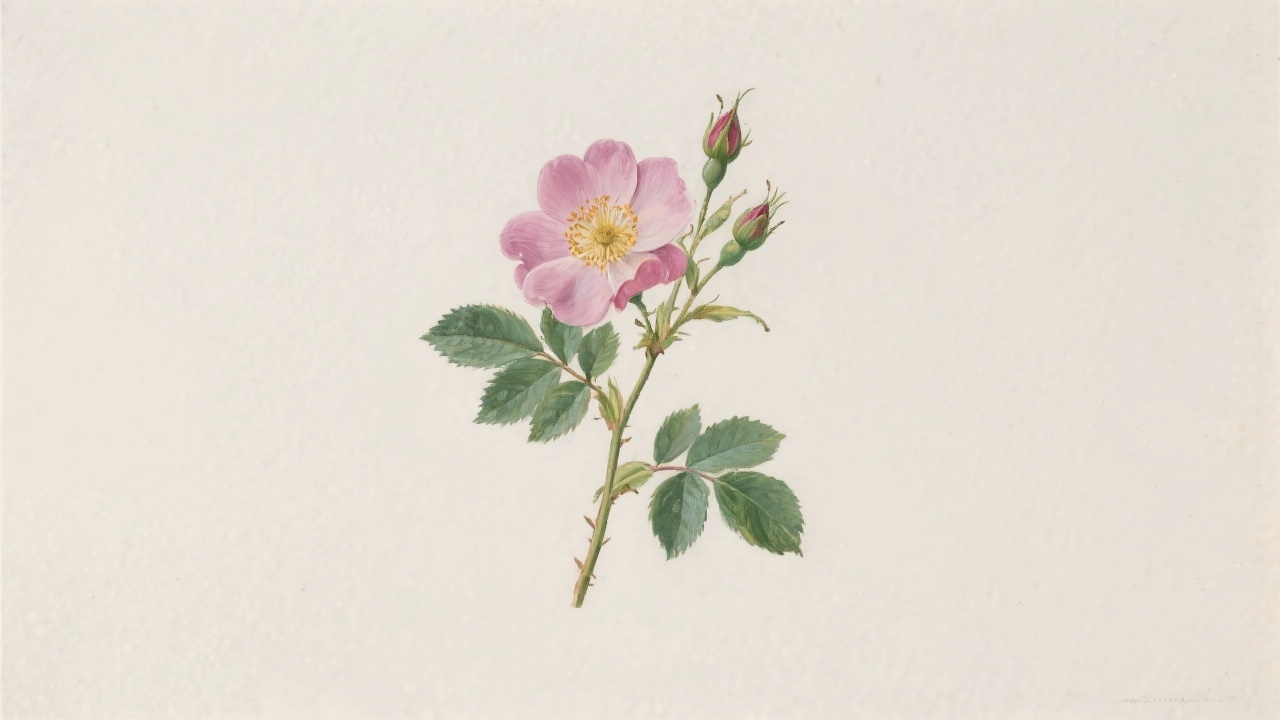 Prompt: a painting of a dog rose, Rosa canina, on a completely blank plain background.