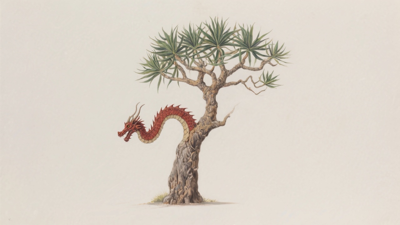 Prompt: a painting of a dragon tree, Dracaena draco (Canary Islands), Dracaena cinnabari (Socotra), on a completely blank plain background.