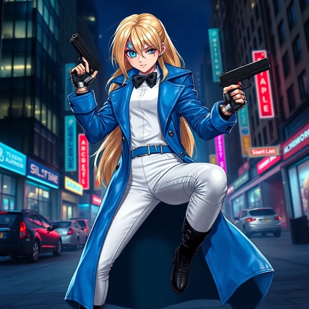 Prompt: Alice, blue eyes, long blue leather trench coat, white leather pants, white shirt, black bow, blonde, black boots, Alice as a cybernetic urban warrior, cybernetic left eye, cybernetic arms, holding a cyberpunk pistol at the ready in one hand, in a cyberpunk city at night, pose ready for action,
