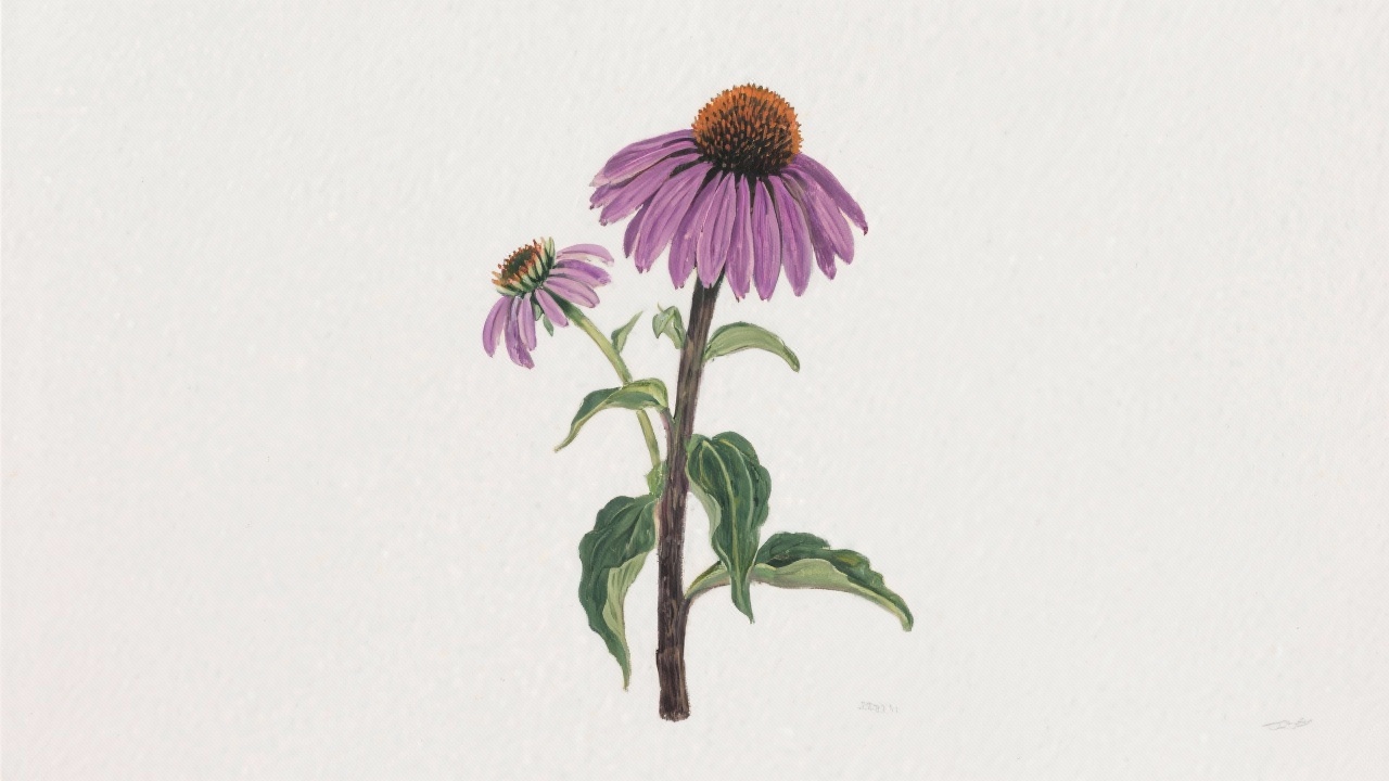 Prompt: a painting of an indian ebony tree, Echinacea purpurea , on a completely blank plain background.