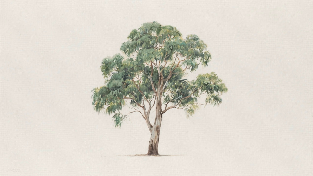 Prompt: a painting of eucalyptus tree,Eucalyptus spp., on a completely blank plain background.