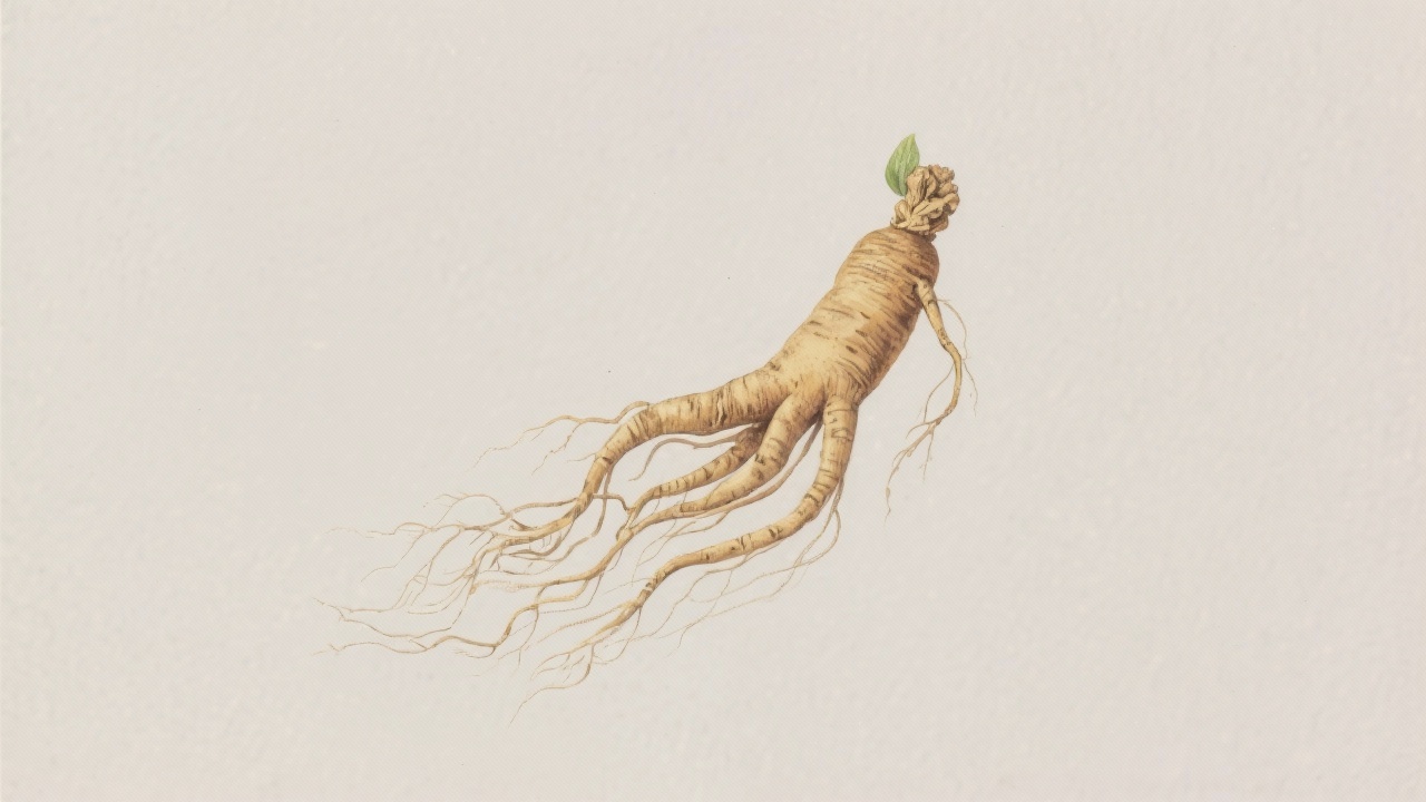 Prompt: a painting of ginseng, Panax ginseng (Asian), Panax quinquefolius (American), on a completely blank plain background.