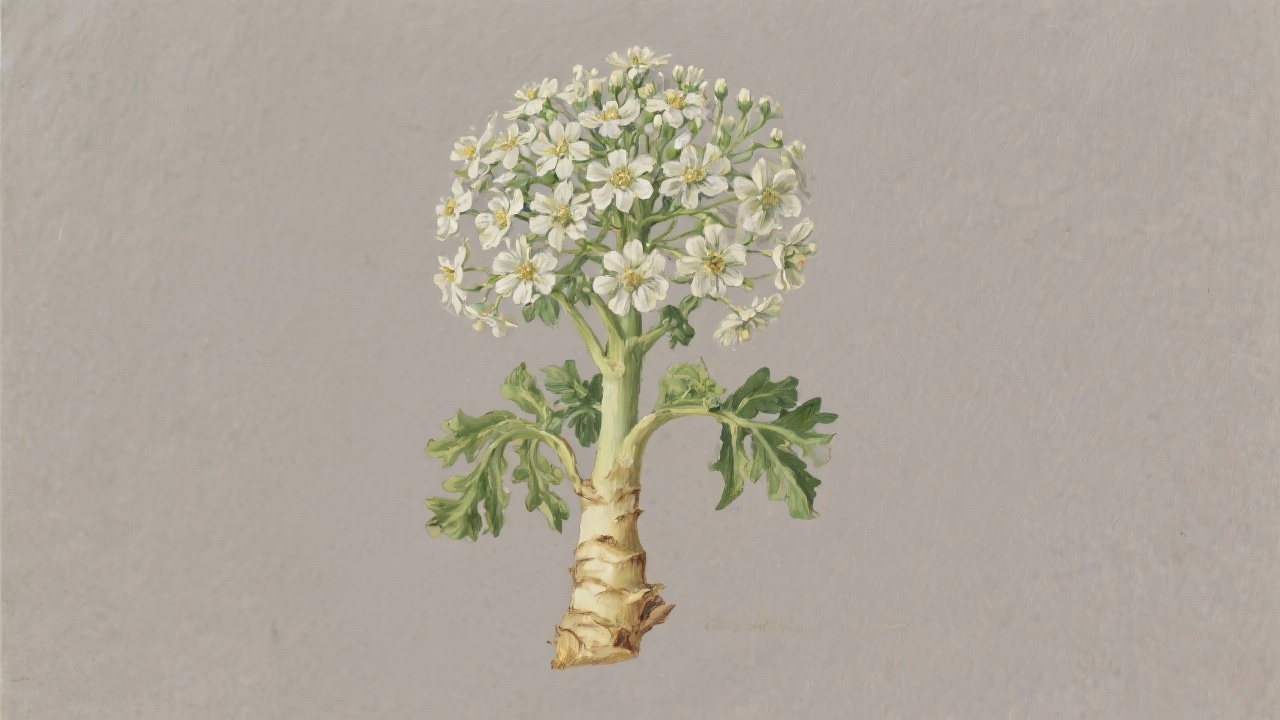 Prompt: a painting of horseradish flowersArmoracia rusticana, on a completely blank plain background.