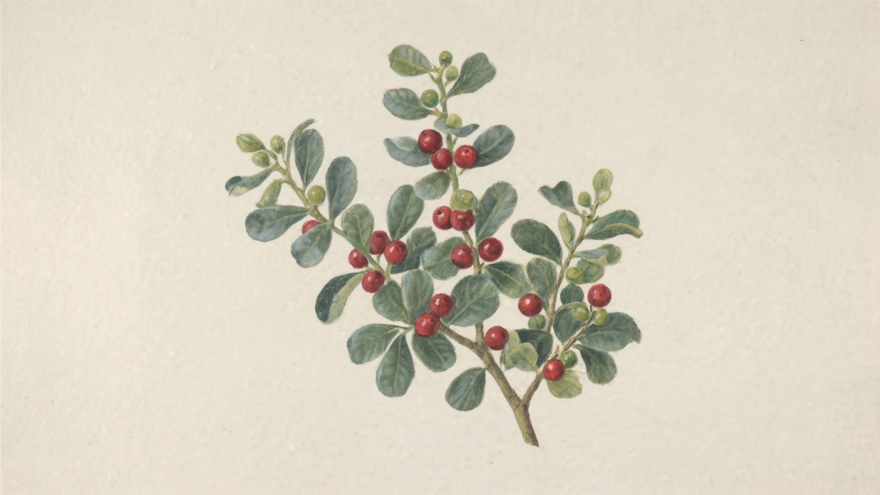 Prompt: a painting of the shrub, Ilex glabra, on a completely blank plain background.