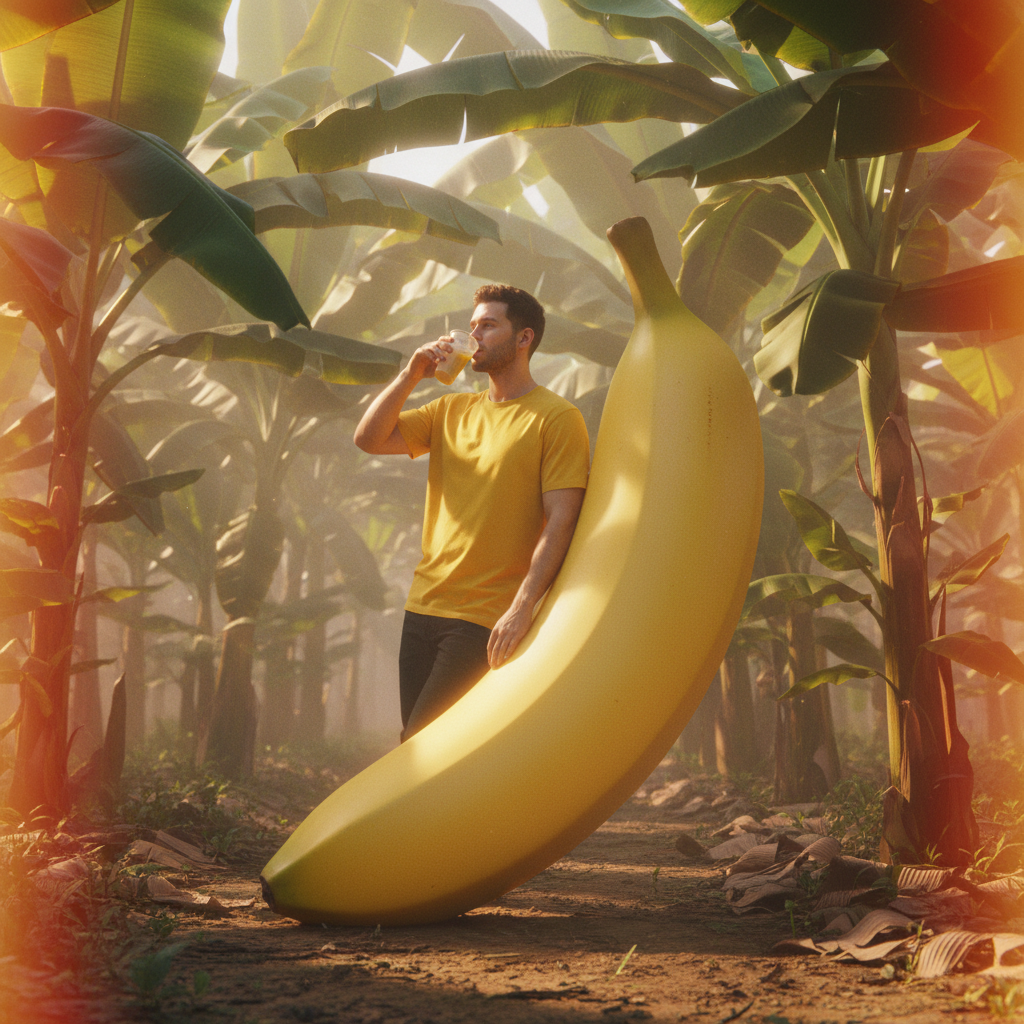 Prompt: A relaxed environmental portrait of a man standing in a tropical banana forest, framed at eye-level with a grounded, cinematic perspective. His body settles into a natural Contrapposto Tilt — weight anchored into one hip, shoulders drifting into a soft counterbalance. He leans gently against a giant, slightly surreal banana: its surface smoother and more uniform than nature, with a clean gradient of yellow, minimal blemishes, and a subtle product-like sheen that hints at stylization without becoming cartoonish. He lifts a cup of juice casually in one hand, adding a simple narrative gesture.