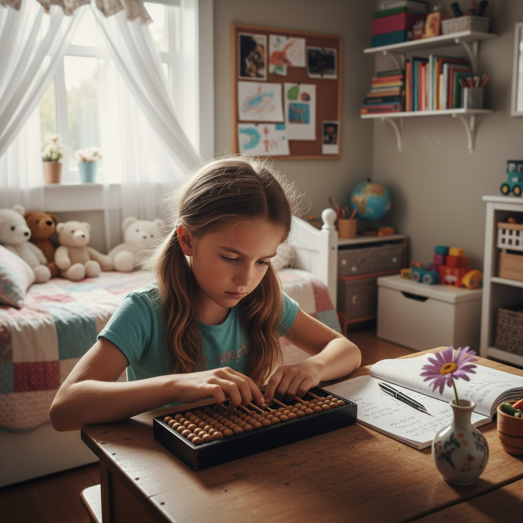 Prompt: design an image of a european girl sitting at a desk using an Japanese soroban to make calculations. on the desk there are also a book with calculations, pen, a flower. behind there is a room for a little girl of 9 years old