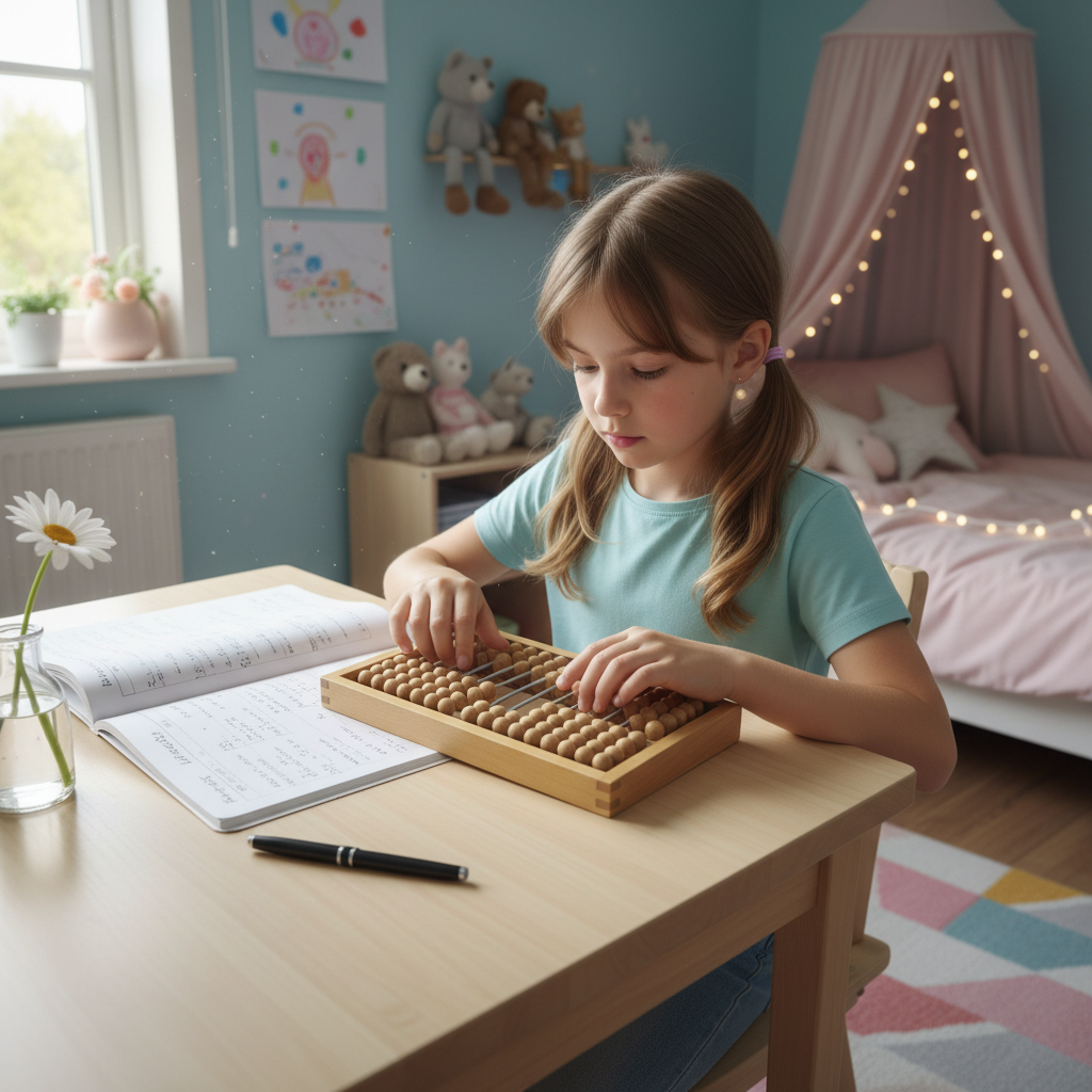 Prompt: design an image of a european girl sitting at a desk using an Japanese soroban to make calculations. on the desk there are also a book with calculations, pen, a flower. behind there is a room for a little girl of 9 years old.