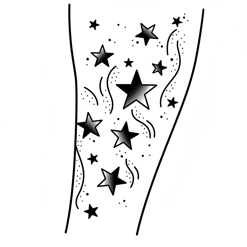 This sleeve filler concept utilizes classic scattered stars and dot work, symbolizing guidance, inspiration, and cosmic connection. The various sizes and placements of these elements are designed to create a harmonious flow, effectively linking disparate tattoo pieces or filling negative space with timeless symbolism and a sense of wonder. It represents finding one's path and the small, significant moments that compose a larger journey.