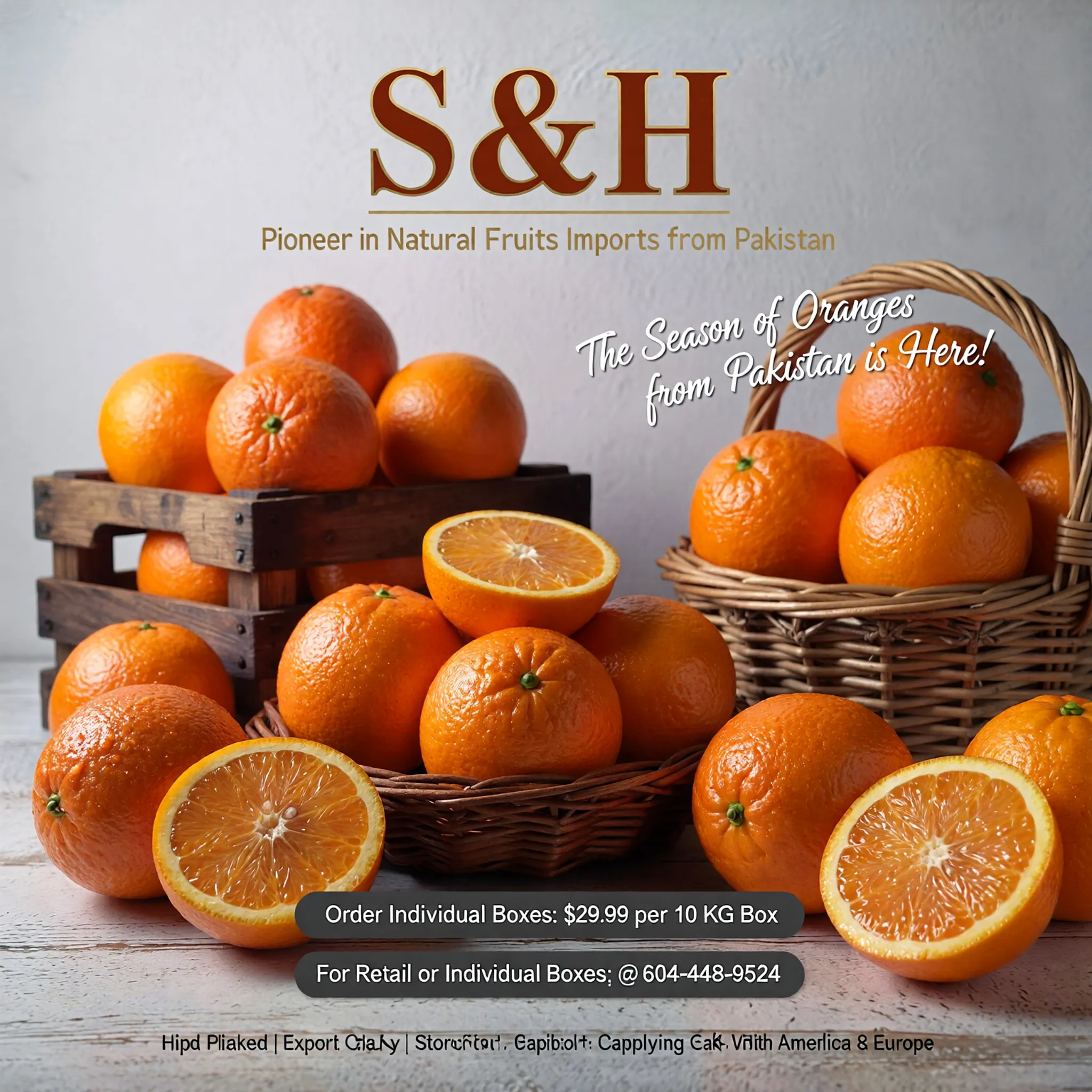 Prompt: S & H is the pioneer in natural fruits imports from Pakistan, this is the season of oranges from Pakistan. So don’t miss this opportunity and order @ 604-448-9524 for retails or individual boxes price is $ 29.99 per 10 KG box. And for distribution or store please call us at 604-448-9524 and book your orders. We bring our Oranges from our own Orchards hand picked and export quality, we supply in North America and Europe.