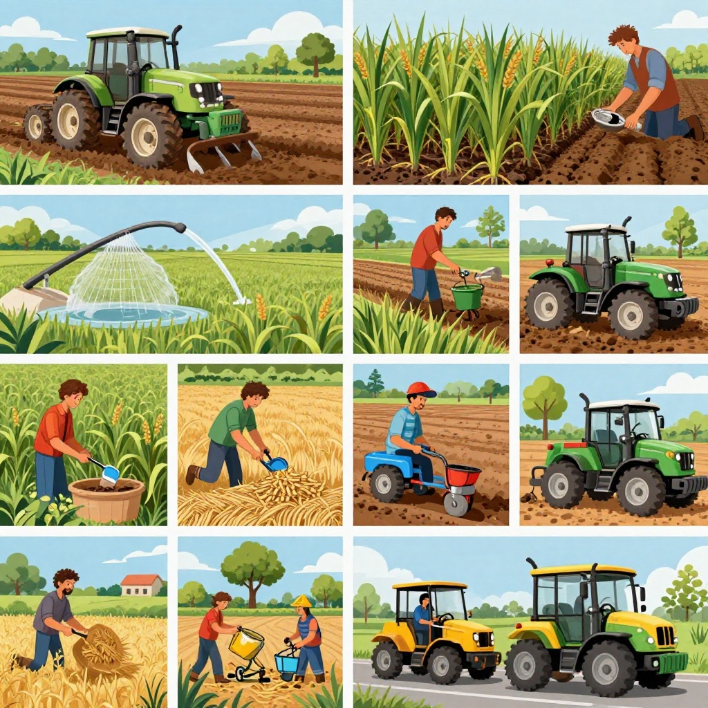 Prompt: Generate this where the various stages of crop production is seen । Such as ploughing, enrichment of soil,sowing, irrigation,use of chemicals,threshing,harvest and storage,transpotation,etc.