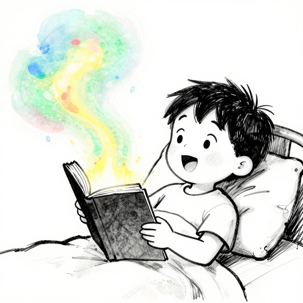 Prompt: A whimsical, minimalist ink drawing of a child in a hospital bed, eyes wide with wonder. The child is holding an open book from which a magical, swirling vortex of light erupts, illuminating their joyful face. The style features Quentin Blake’s signature scratchy, energetic pen-and-ink linework. Most of the scene is stark white and black ink, but the magic streaming from the book is rendered in soft, translucent watercolor washes of pale red, sunny yellow, sky blue, and mint green. High contrast, expressive movement, and a sense of profound hope.