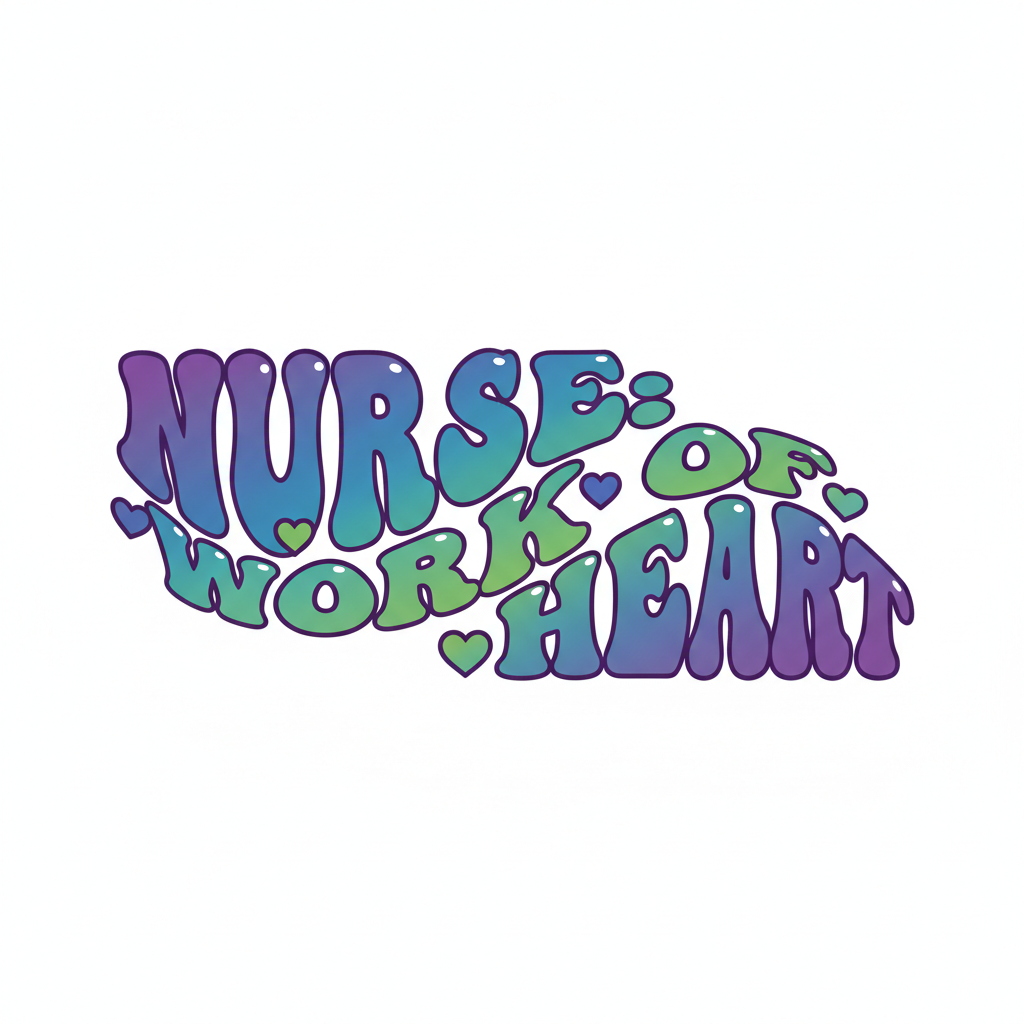 Prompt: A sleek Groovy-style typography design on a pure white background. The text "NURSE: WORK OF HEART" is written in a continuous, flowing, and wavy retro script font. The letters have a rhythmic, psychedelic distortion and are filled with a gradient of cool colors (blue, green, and purple). Small stylized illustrative elements like minimal hearts fill the gaps. Bold outlines, flat vector art, 70s hippie aesthetic. Absolutely no stars, flowers, or extra decorations. Focused entirely on the artistic shape of the letters.
