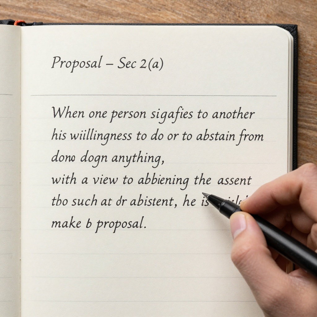 Prompt: Proposal – Sec 2(a) When one person signifies to another his willingness to do or to abstain from doing anything, with a view to obtaining the assent of that other to such act or abstinence, he is said to make a proposal.