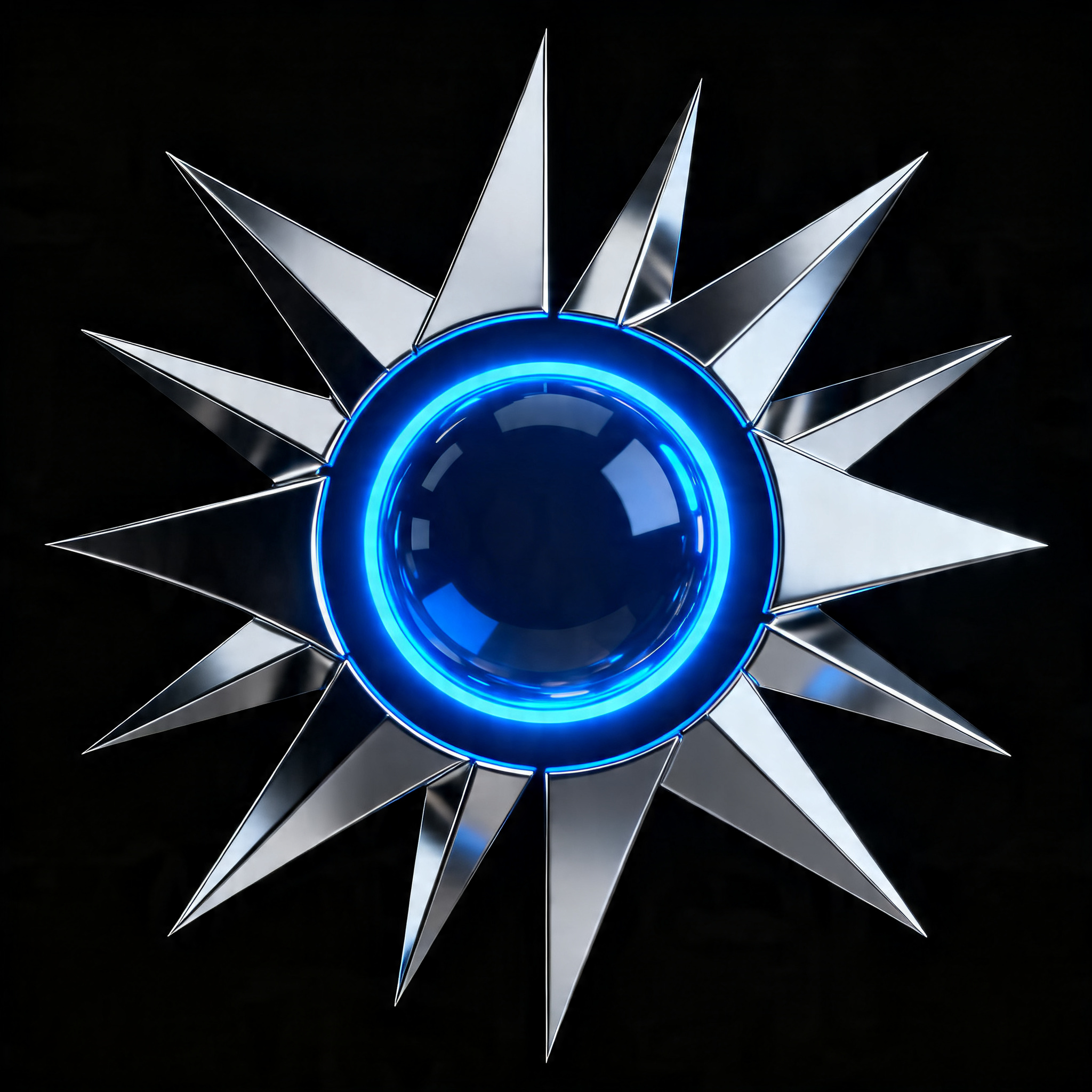 Logo Concept: This logo concept fuses the mythological grandeur of Hyperion, the Titan god of light and observation, with a sleek, cutting-edge cyberpunk style. The central neon blue orb symbolizes Hyperion's celestial light, power, and serves as a focal point, representing the core of innovation. The surrounding sharp, silver metallic segments form a stylized, angular 'eye' or radiating energy, conveying a vigilant, commanding presence and a focus on high-fidelity visual experiences. The geometric precision and bold lines signify the studio's AAA quality and technological prowess, creating a cool and impactful identity within the gaming industry.