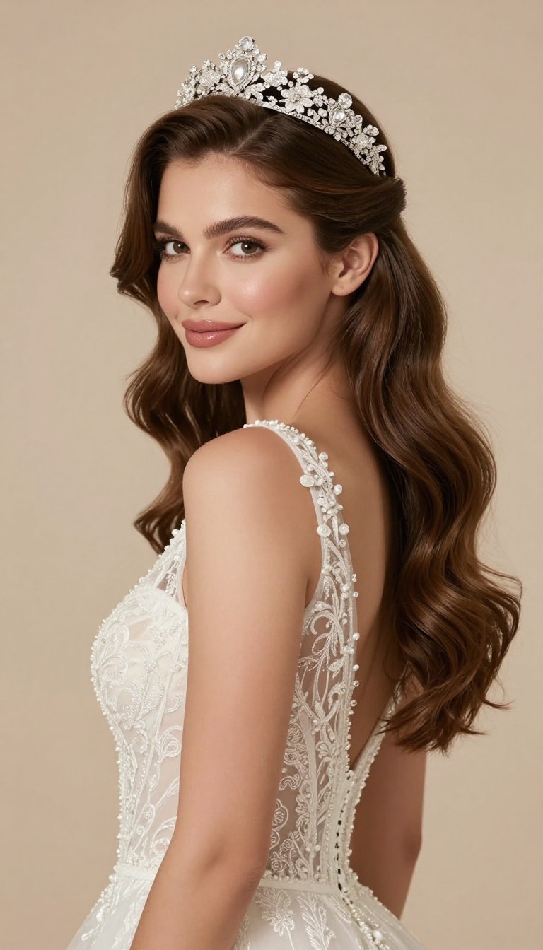 Prompt: A stunning elegant bride with long wavy brown hair styled in a half-up half-down hairstyle, adorned with a delicate floral crystal hair crown. She is wearing a luxurious white lace wedding gown with intricate embroidery and an open back design. The bride is slightly turned backward, looking over her shoulder with a soft, confident smile.