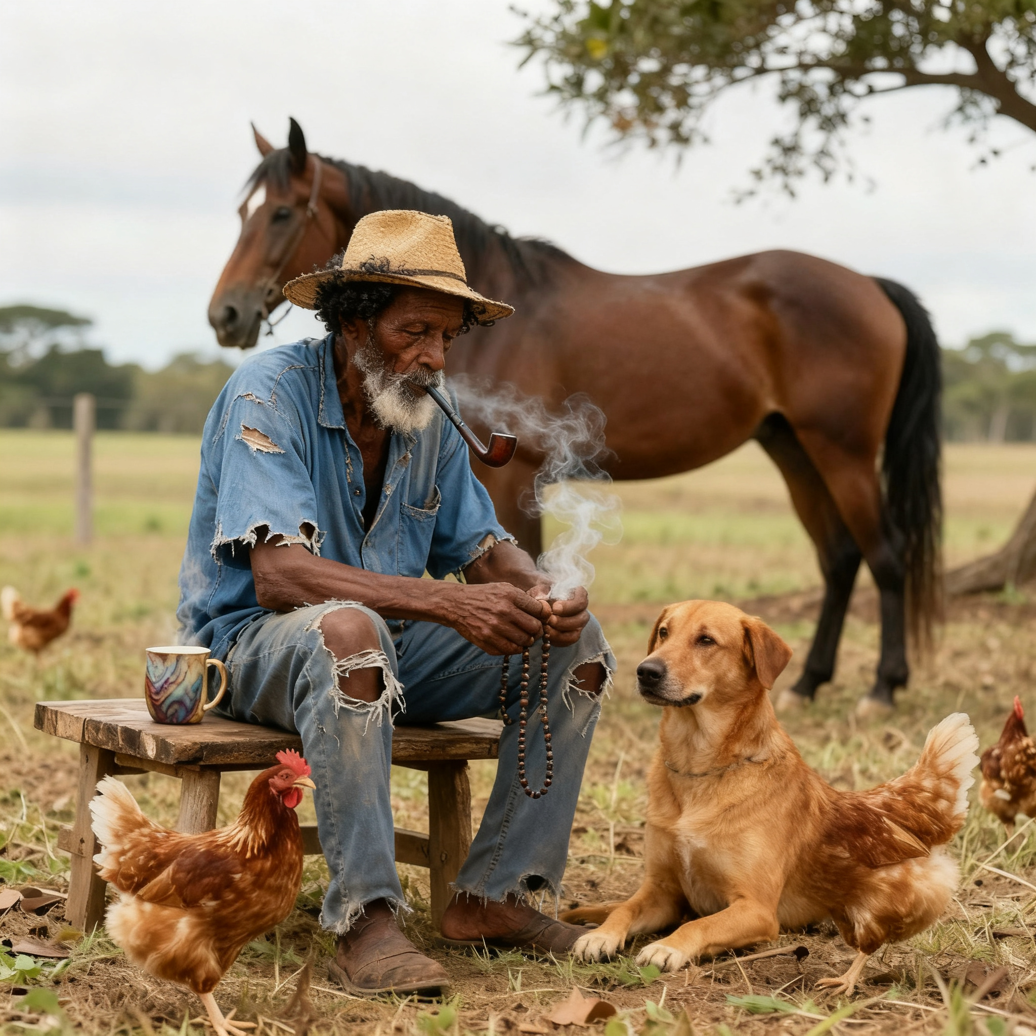 Prompt: A farm landscape on a beautiful sunny day: a 70-year-old Black man with a beard, mustache, and curly black hair with many white strands sits on a rustic wooden bench, smoking an old pipe. He wears a straw hat, ripped pants, and an old, slightly torn blue dress shirt. A caramel-colored dog sits beside him on the ground. Around them, four chickens peck at the ground. On the bench rests an agate mug with coffee rising softly from its steam. In the background, a beautiful Mangalarga Marchador horse stands still. The old man holds a rosary in one hand.