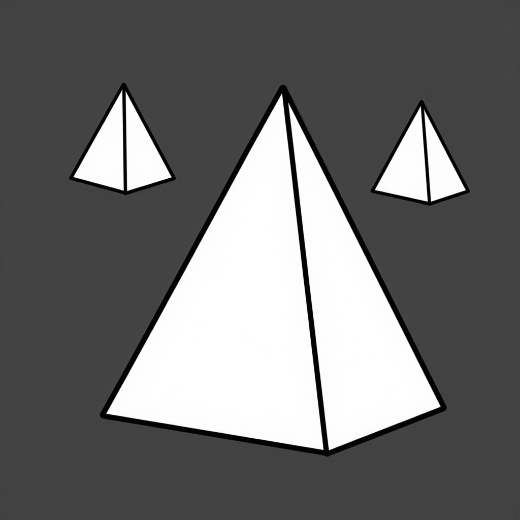 Prompt: A geometric creature: Consisting of a large upside-down equilateral-triangle-base tetrahedron of isosceles triangle sides with the downwards facing tip angle being 40 degrees. Color is a solid white with a distinct doubled black outline. Beside it two smaller tetrahedra of same style, floating and pointing their tips outwards.