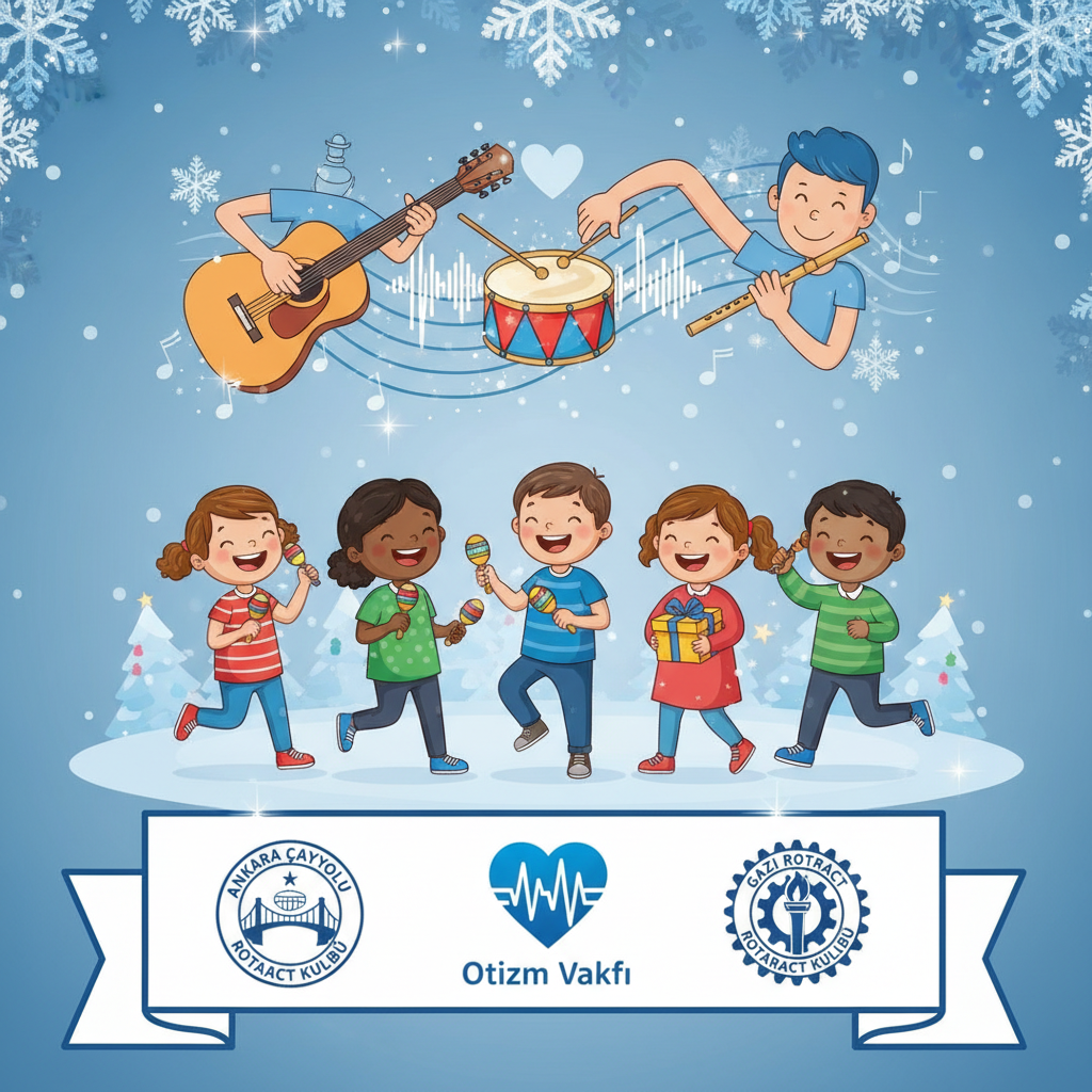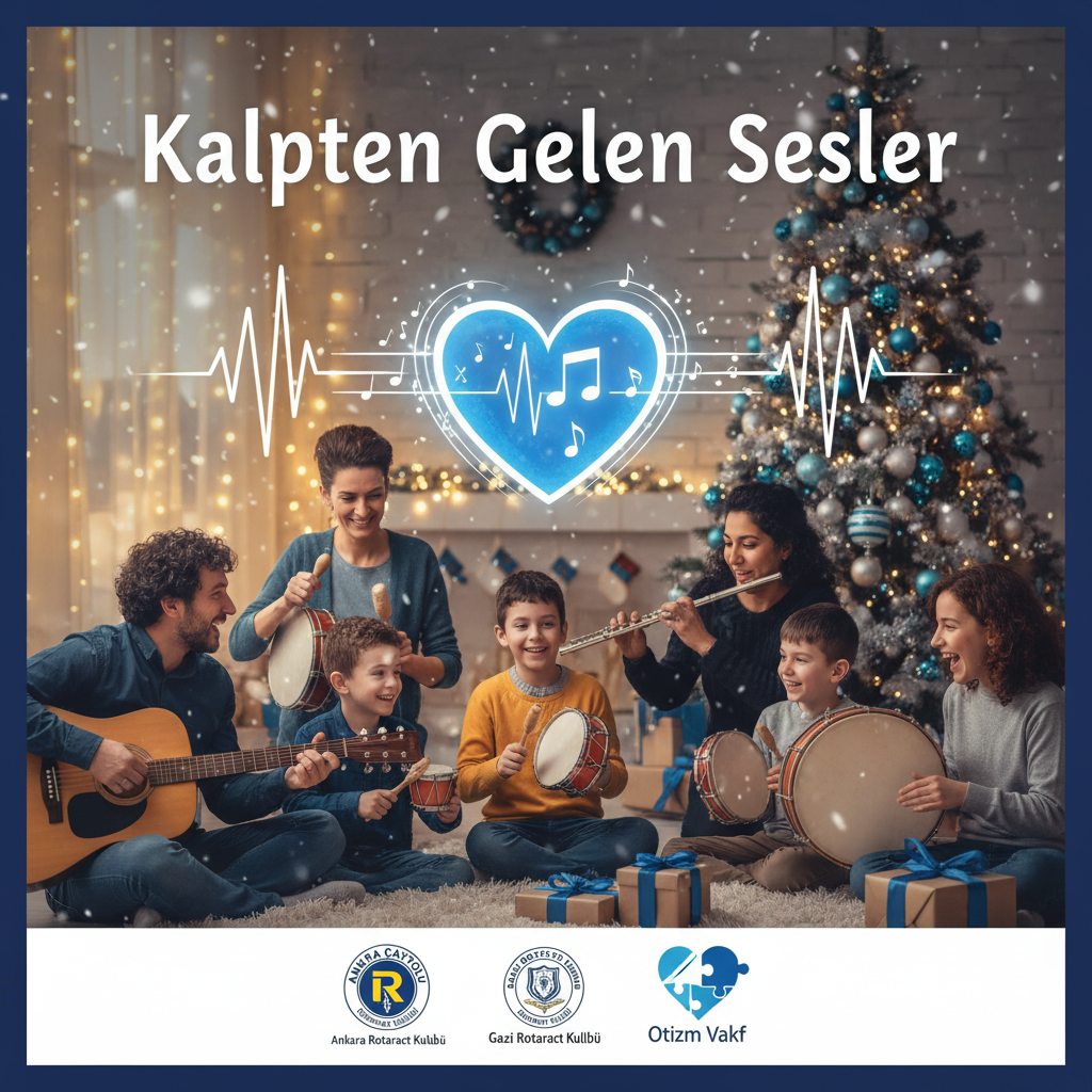 Prompt: bizim şimdi şöyle bir projemiz var kalpten gelen sesler otizm vakfıyla yapacağız, sana şimdi kulüp logolarını atacağım o logoları afişin altına güzel şekilde yaptığın tasarıma göre ekler misin ? Ankara Çayyolu ve Gazi Rotaract Kulüpleri olarak, Otizm Vakfı iş birliği ile gerçekleştireceğimiz ve yeni yıl ruhunu birlikte taçlandıracağımız Kalpten Gelen Sesler 🎄💙 projemize sizleri davet etmekten büyük mutluluk duyuyoruz. Müzik ve ritmi bir araya getireceğimiz bu özel projede, bizler enstrümanlar eşliğinde şarkılar çalarken 🎶 otizmli dostlarımız ritim tutarak bize eşlik edecekler 🥁. Böylece hem çocuklarımızla keyifli vakit geçirerek hem de onlara küçük yılbaşı hediyeleri vererek 🎁 yeni yılı birlikte kutlamış olacağız. Hep birlikte kalpten gelen seslerle unutulmaz bir gün yaşayacağımıza inanıyoruz proje açıklaması da bu. Bu projeye göre bana afişler hazırlar mısın logolar bunlar güzel afiş hazırla lütfen afişde yazı olmayacak ve görsele uygun logolar olucak