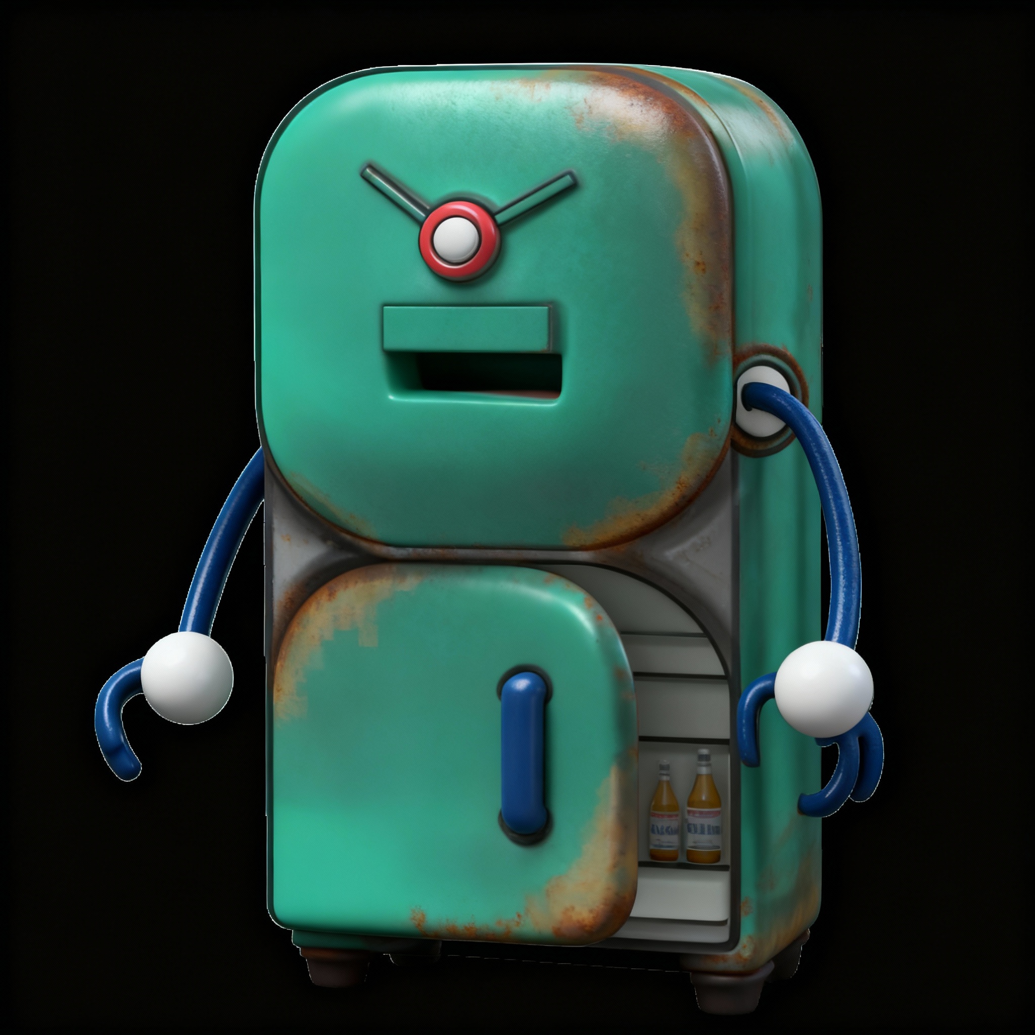 Prompt: I want you to make the green fridge to have the semi realistic cartoonish style of the human charster in blue: