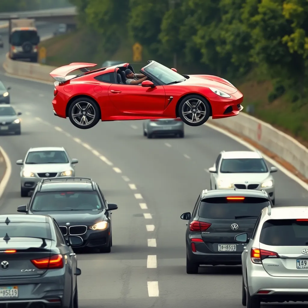 Prompt: A sleek metallic blue sports car revs in a traffic jam, suddenly lifting off the ground as it soars over stalled vehicles. It gracefully glides above the cars, leaving onlookers in awe. As it clears the last vehicle, the driver lands smoothly on an open road and accelerates away, continuing their journey unimpeded.