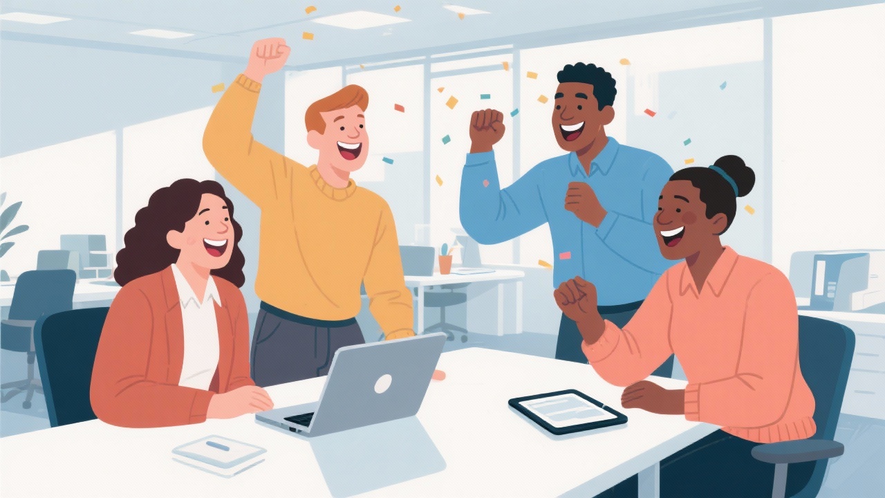 Prompt: uthentic diverse business team celebrating end-of-year success, laptop and tablet on table, casual clothing, genuine laughing expressions, modern office interior, natural lighting, candid photography, 4K resolution