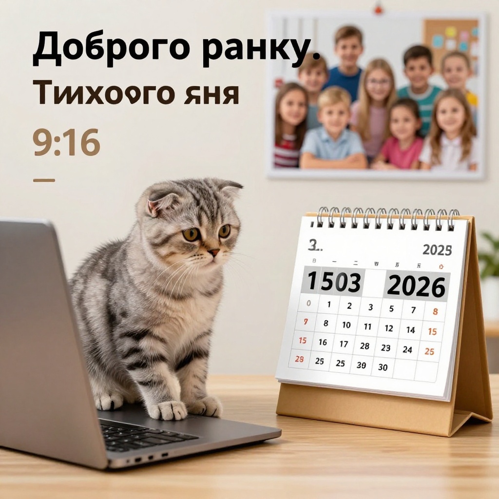 Prompt: A Scottish Fold kitten is sitting at a computer. There is a flip calendar on the table, showing the date 15/03.2026. ON THE WALL IS A GROUP PHOTO OF SCHOOLCHILDREN. At the top of the image, insert the followingtext in Ukrainian: Доброго ранку. Тихого дня. 9:16 aspect ratio