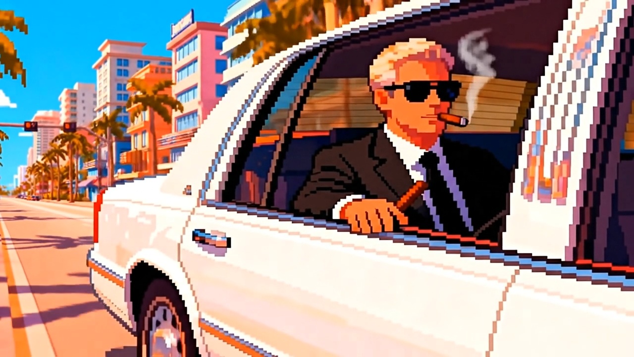 Prompt: pixelated video of a guy sitting in a limo driving down a street in miami