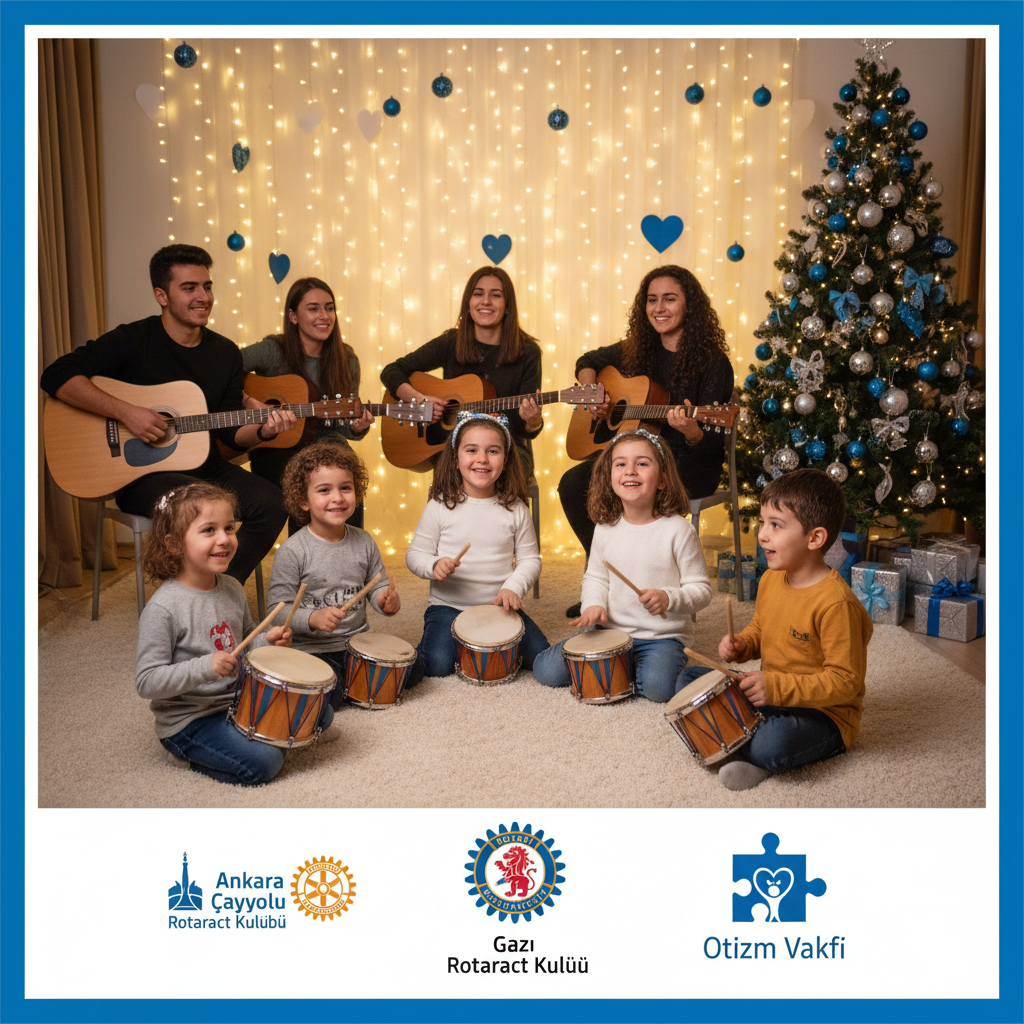 Prompt: bizim şimdi şöyle bir projemiz var kalpten gelen sesler otizm vakfıyla yapacağız, sana şimdi kulüp logolarını atacağım o logoları afişin altına güzel şekilde yaptığın tasarıma göre ekler misin ? Ankara Çayyolu ve Gazi Rotaract Kulüpleri olarak, Otizm Vakfı iş birliği ile gerçekleştireceğimiz ve yeni yıl ruhunu birlikte taçlandıracağımız Kalpten Gelen Sesler 🎄💙 projemize sizleri davet etmekten büyük mutluluk duyuyoruz. Müzik ve ritmi bir araya getireceğimiz bu özel projede, bizler enstrümanlar eşliğinde şarkılar çalarken 🎶 otizmli dostlarımız ritim tutarak bize eşlik edecekler 🥁. Böylece hem çocuklarımızla keyifli vakit geçirerek hem de onlara küçük yılbaşı hediyeleri vererek 🎁 yeni yılı birlikte kutlamış olacağız. Hep birlikte kalpten gelen seslerle unutulmaz bir gün yaşayacağımıza inanıyoruz proje açıklaması da bu. Bu projeye göre bana afişler hazırlar mısın logolar bunlar güzel afiş hazırla lütfen afişde yazı olmayacak ve görsele uygun logolar olucak