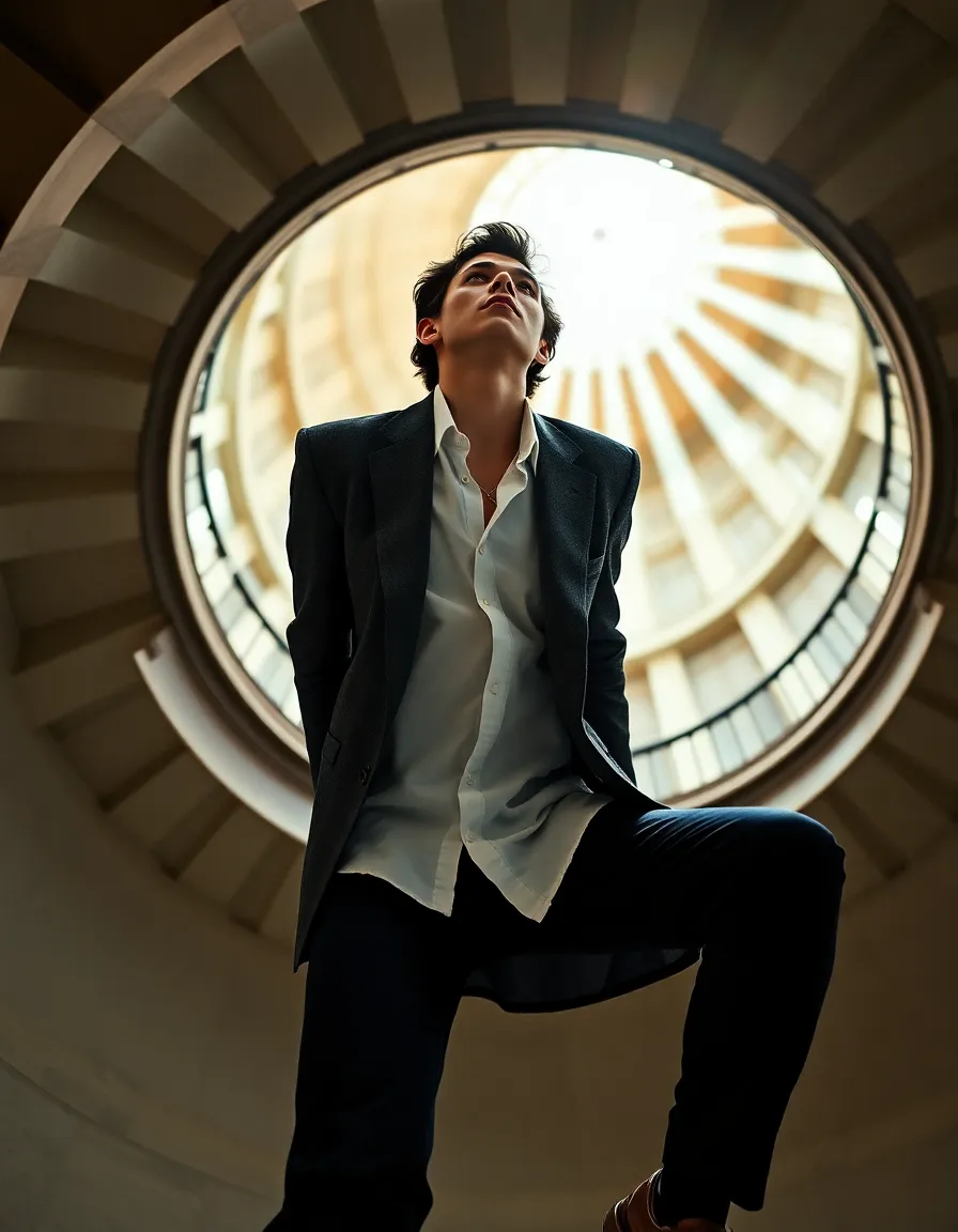 Prompt: create a Realistic 8K portrait, 24mm wide-angle lens. Scene on a majestic spiral staircase with imposing architecture. Soft natural light enters from the circular top, creating ethereal beams. Subject in upward motion, slightly tilted, expressing ascension and transcendence. Gaze directed upward, deep and poetic.