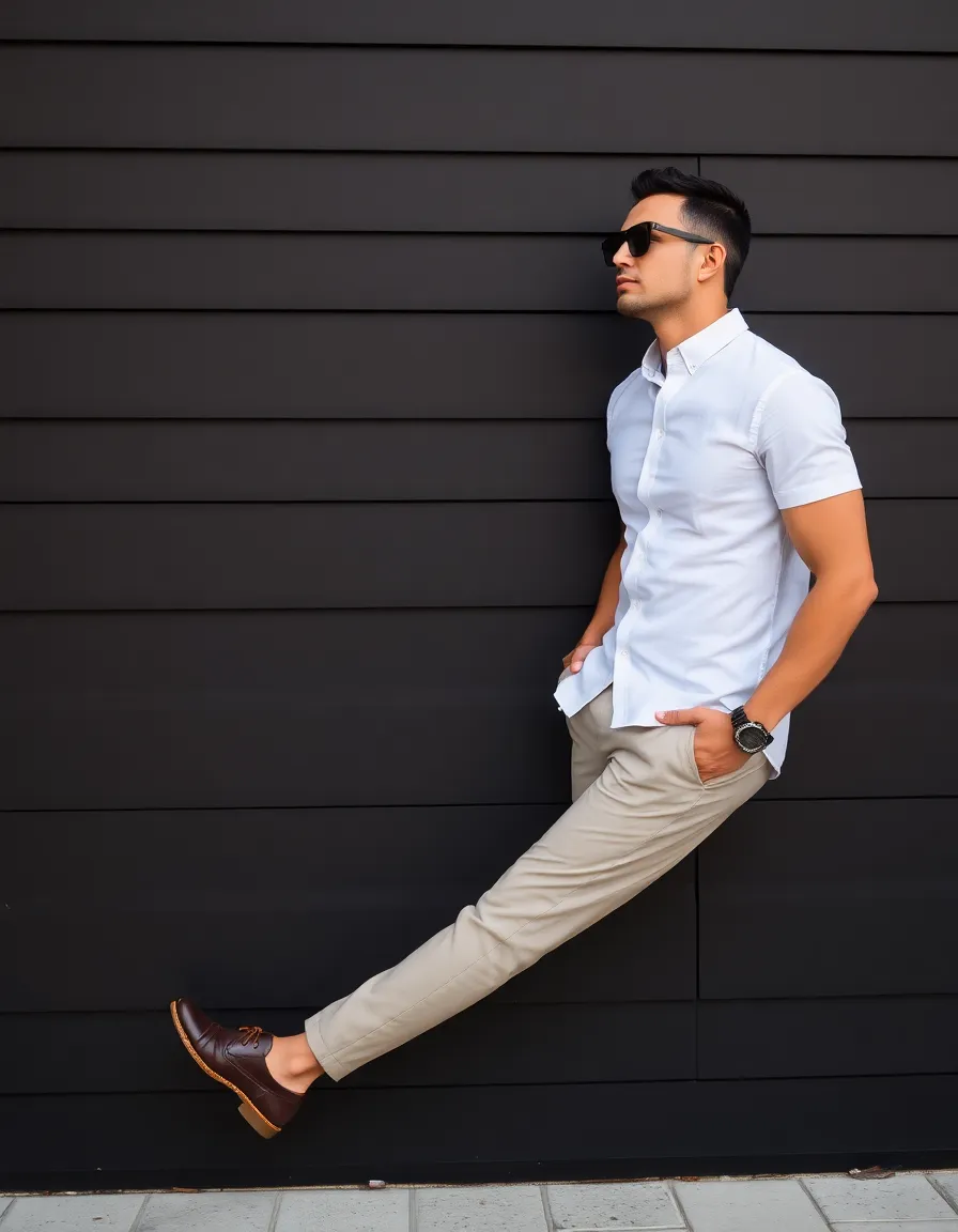 He wears an elegant and modern outfit. A white, short-sleeved dress shirt made of a lightweight fabric (possibly linen or cotton) with a slim fit accentuates his physique. The collar is structured (mandarin-style or with hidden buttons), and the shirt is unbuttoned at the top, revealing a bit of chest. The pants are formal or chino, black or very dark navy blue, with a slim cut and slightly shorter length (above the ankle). A light brown (caramel) leather belt with a silver buckle accentuates the waist, creating a color contrast. On his feet, he wears white leather sneakers, minimalist sneaker style, with no visible socks. Accessories include dark sunglasses with thin metal frames (aviator style or similar), a wristwatch with a silver metal strap on the left wrist, and a leather or beaded bracelet on the right wrist.