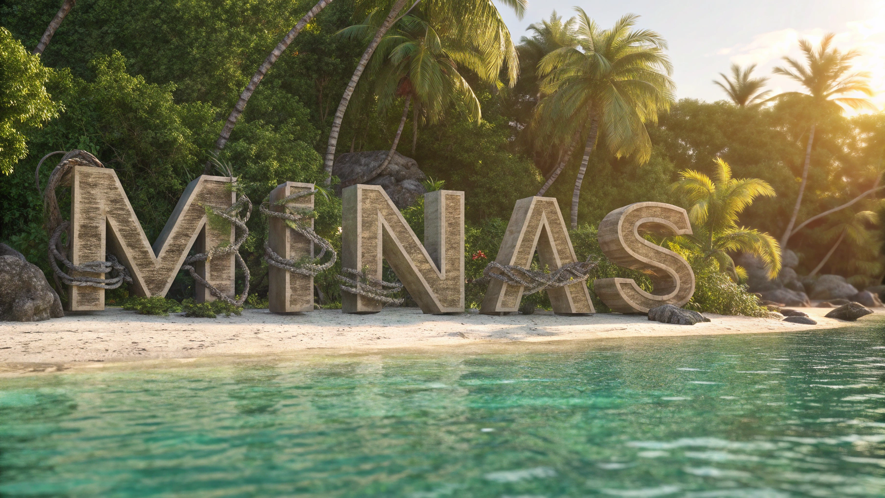 Prompt: The word "MINAS" in massive, hyper-realistic metallic 3D block letters, each letter seamlessly integrated into a small, exotic island setting. The letters are partially wrapped with detailed natural driftwood and realistic vines, surrounded by clear turquoise tropical water with accurate light reflections and caustics. Behind the letters, lush palm trees gently curve, lit by warm golden sunlight breaking through the leaves. Highly detailed roots and sand textures under the letters, showing damp soil and soft beach shadows. Cinematic depth of field, HDR lighting, ultra-sharp rendering, perfect reflections in the water, photorealistic shadows, extremely high detail on metal textures (scratches, reflections, specularity), natural ambient occlusion, surreal but believable tropical paradise atmosphere, fantasy-style island composition with real-world lighting physics, Cinematic