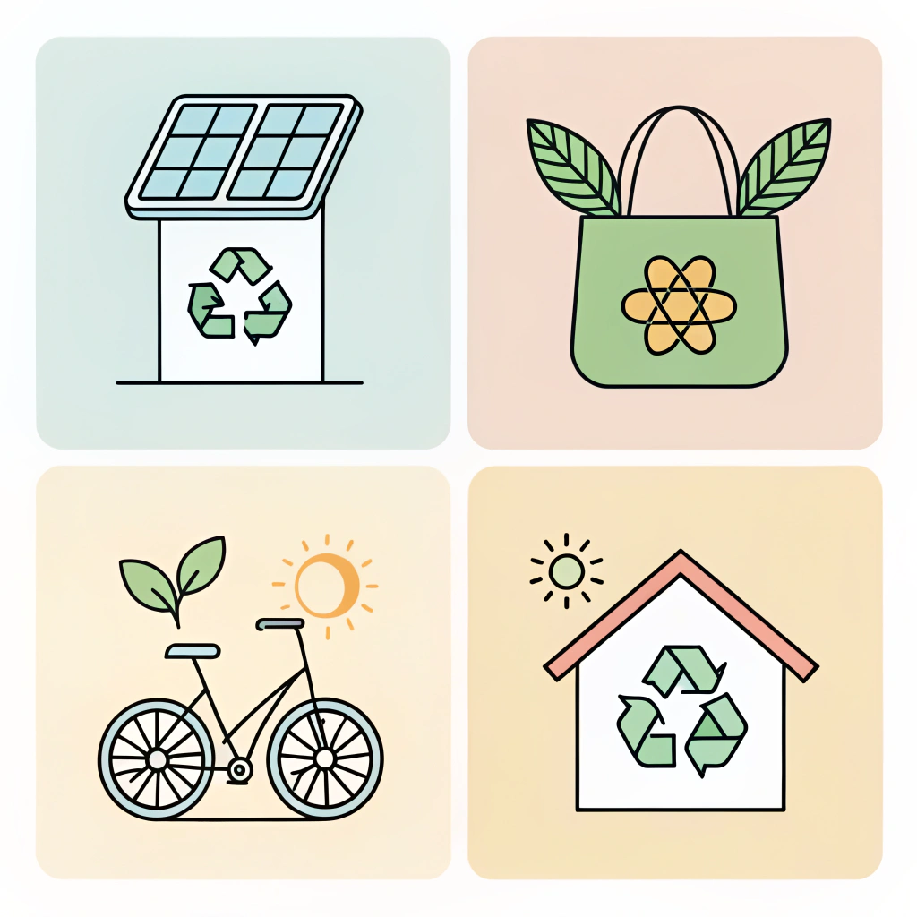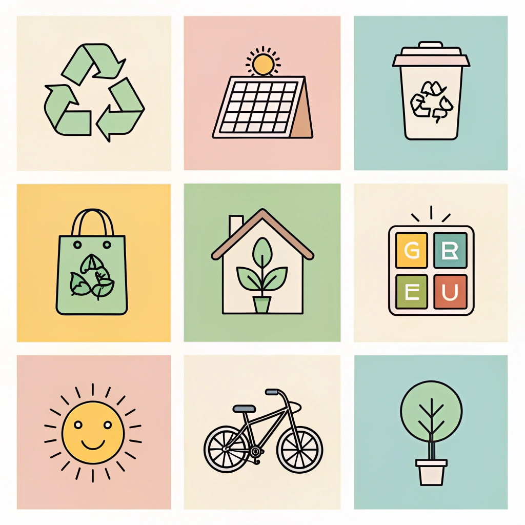 Prompt: lat minimalist eco lifestyle icons: recycling, solar panel, reusable bag, bike, green home, clean line style, pastel palette, scalable vector graphic, no gradients, uniform stroke width
