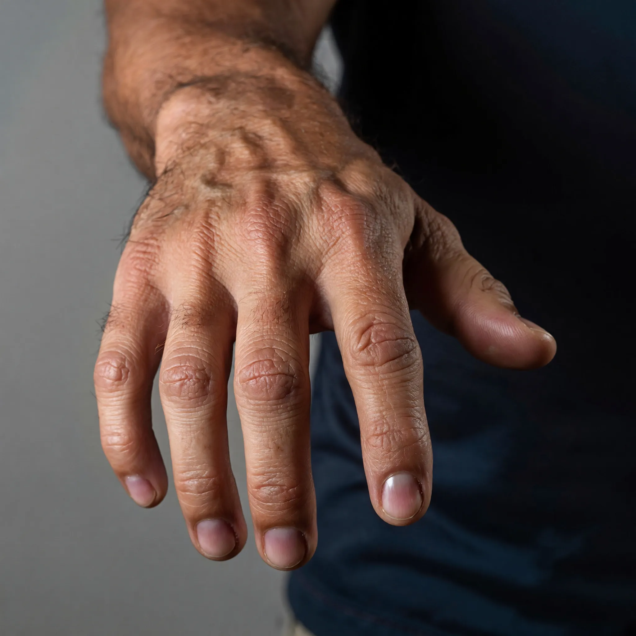 Prompt: make the skin of the hand as black as the face, without changing anything else.