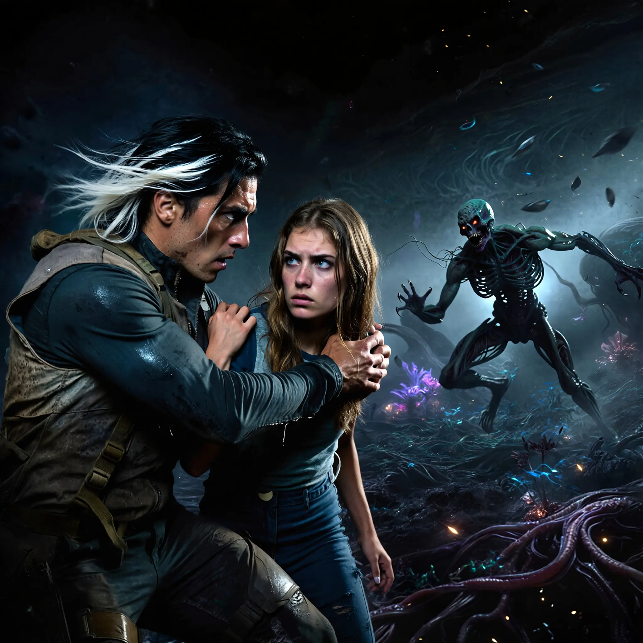 Prompt: Verso Dessendre (the man with the black hair and white streaks in the image) saves Max Mayfield (the girl) from Vecna inside the Upside Down as they clash