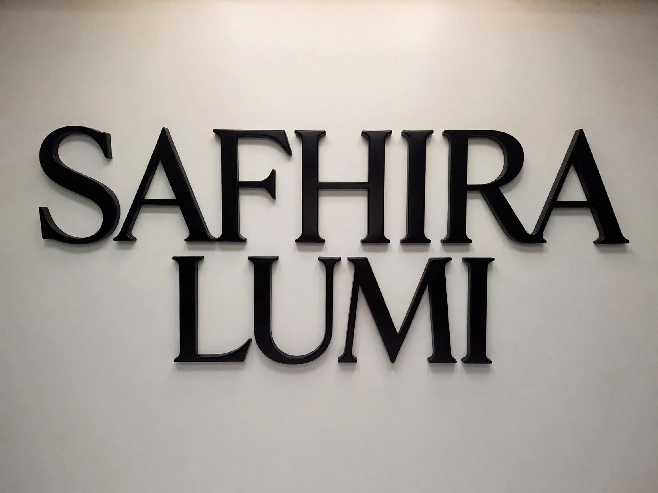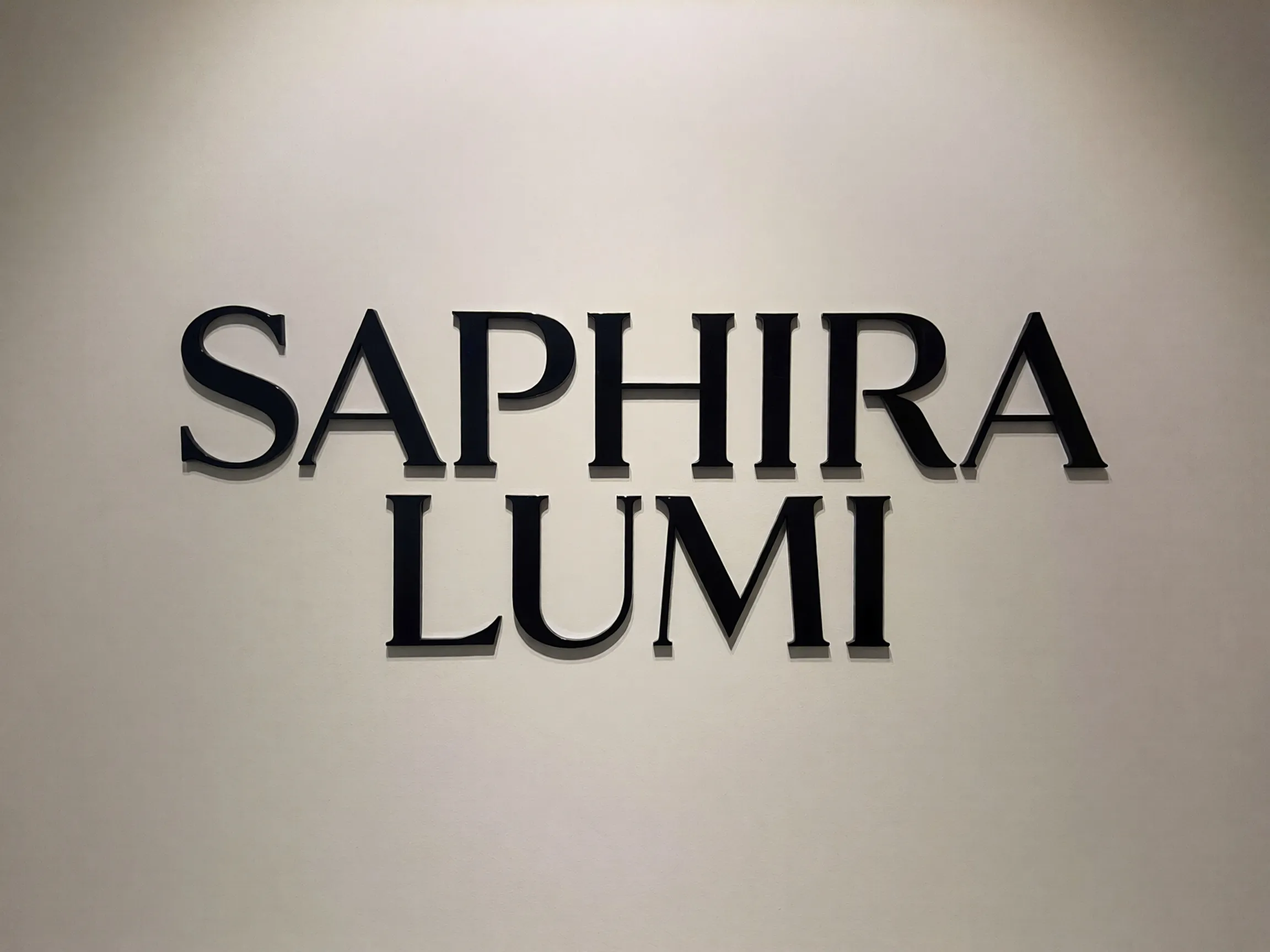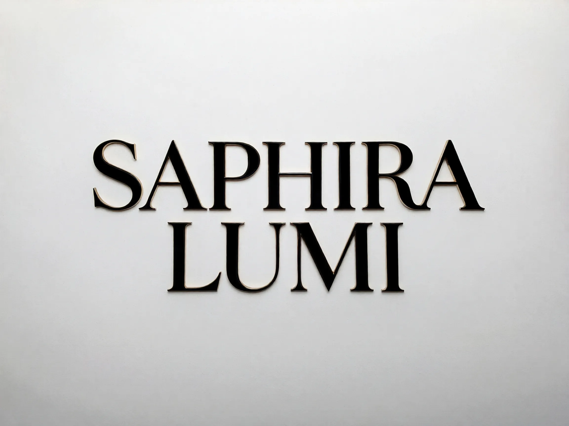 Prompt: Logotipo minimalista apenas com texto para uma marca de joias de luxo chamada 'SAPHIRA LUMI'. Use uma fonte serifada elegante e moderna (estilo Didot ou Bodoni), com alto contraste entre traços grossos e finos. Letras maiúsculas, com espaçamento generoso entre elas (kerning) para transmitir sofisticação. Fundo branco e letras em preto sólido. Sem ícones, foco total na pureza da fonte.