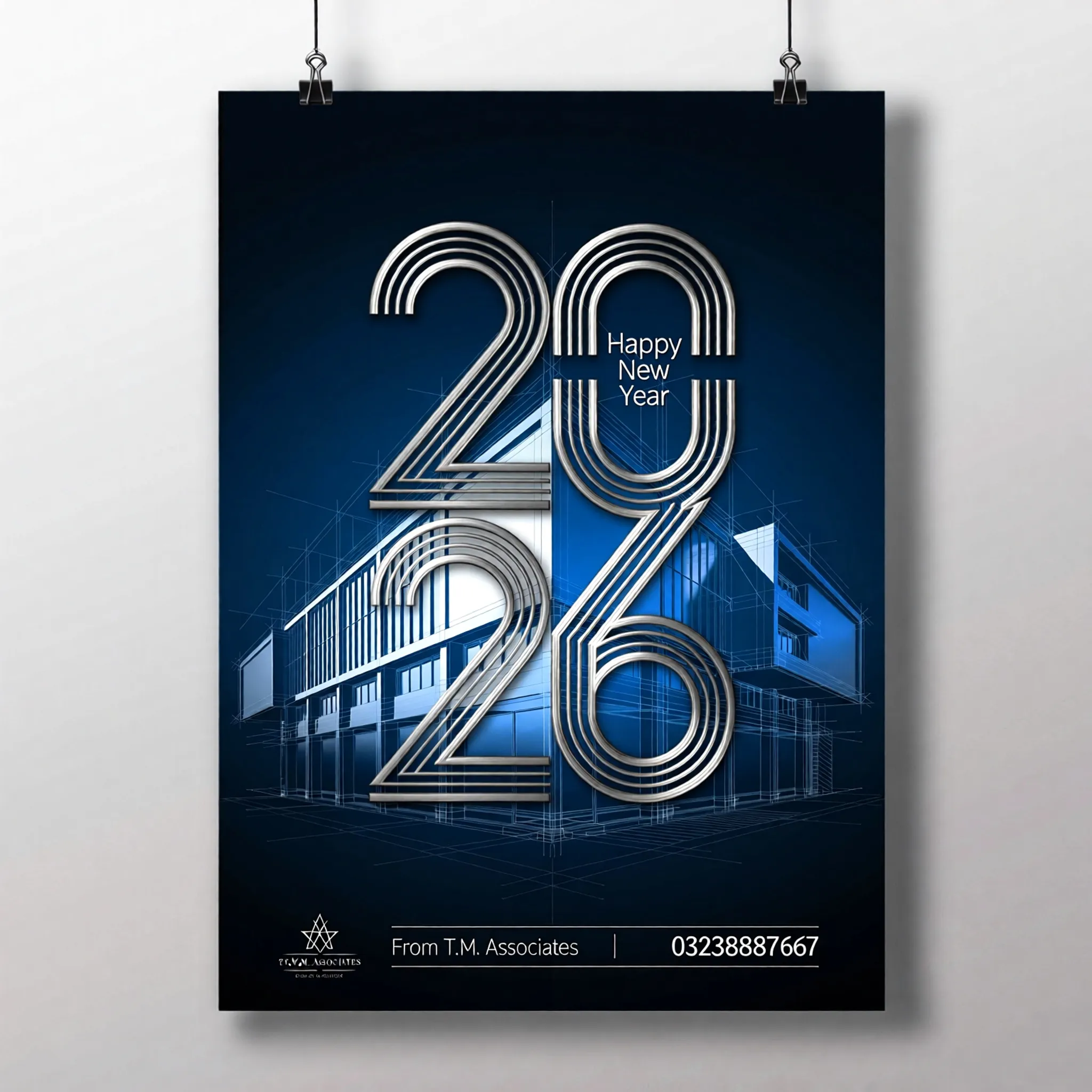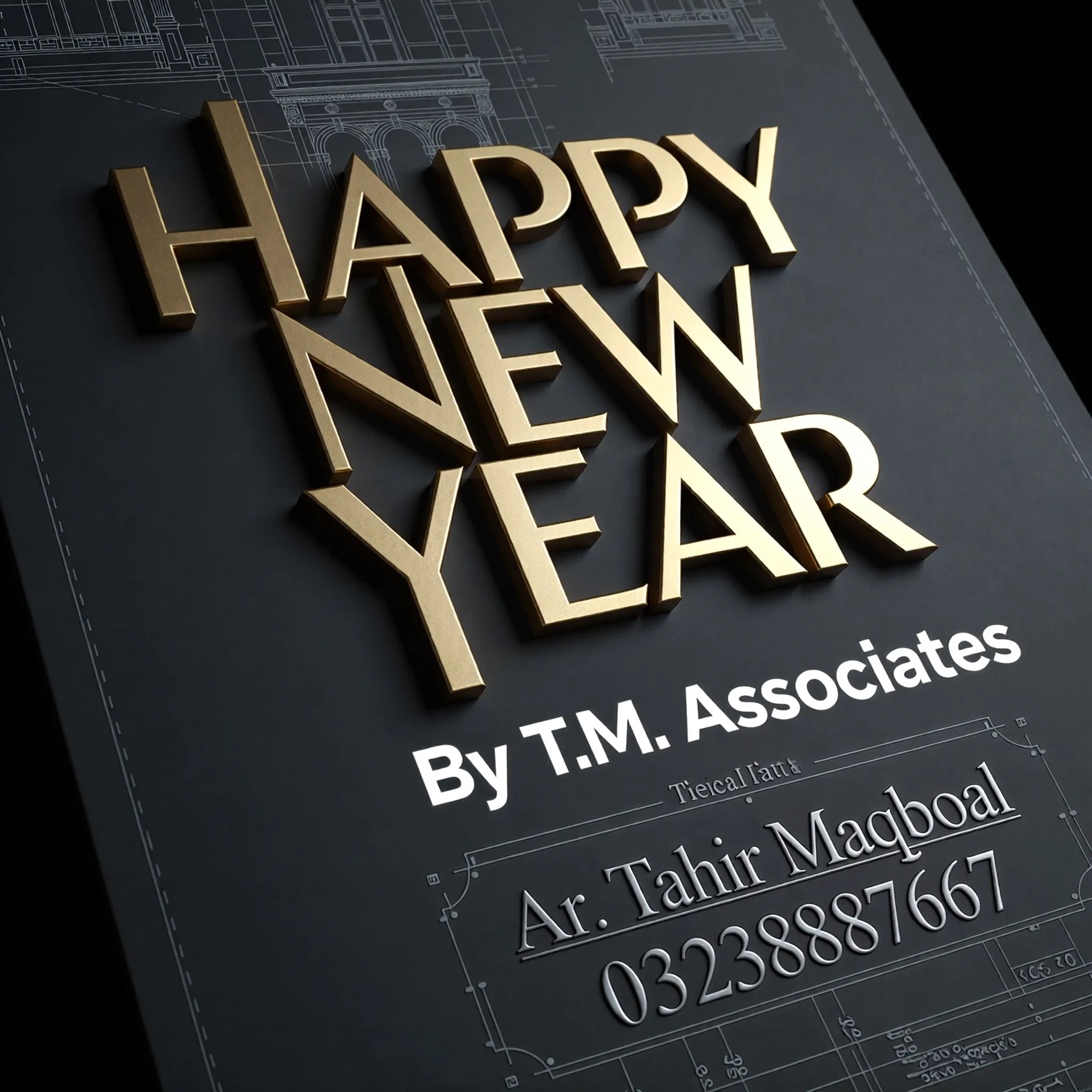 Prompt: Create a Poster of Happy New Year By T.M. Associates, also Mention Name of Ar. Tahir Maqbool and 03238887667, style will be architectural