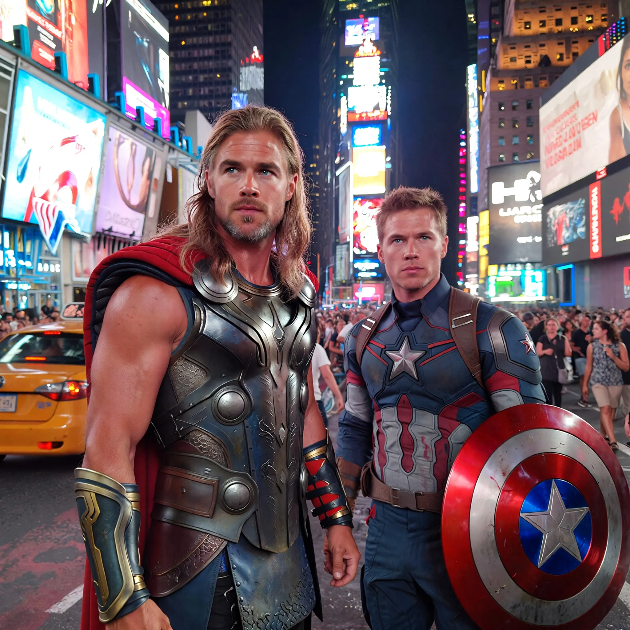 Prompt: Thor standing beside captain America in Times square