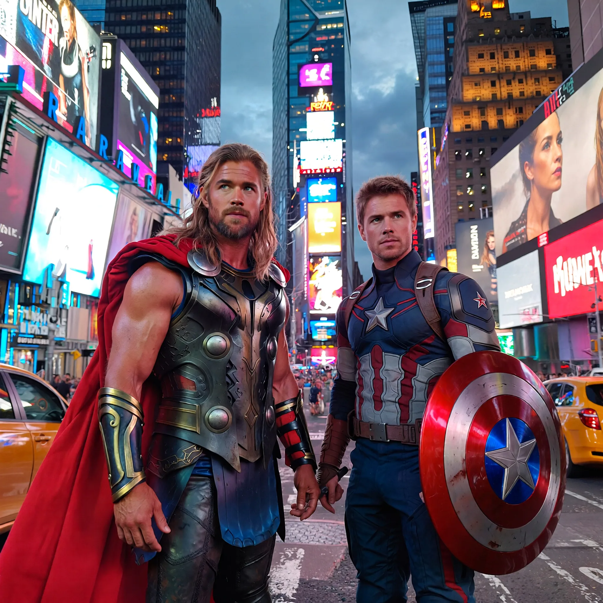 Prompt: Chris Hemsworth as thor and Chris Evans a captain America standing in times square